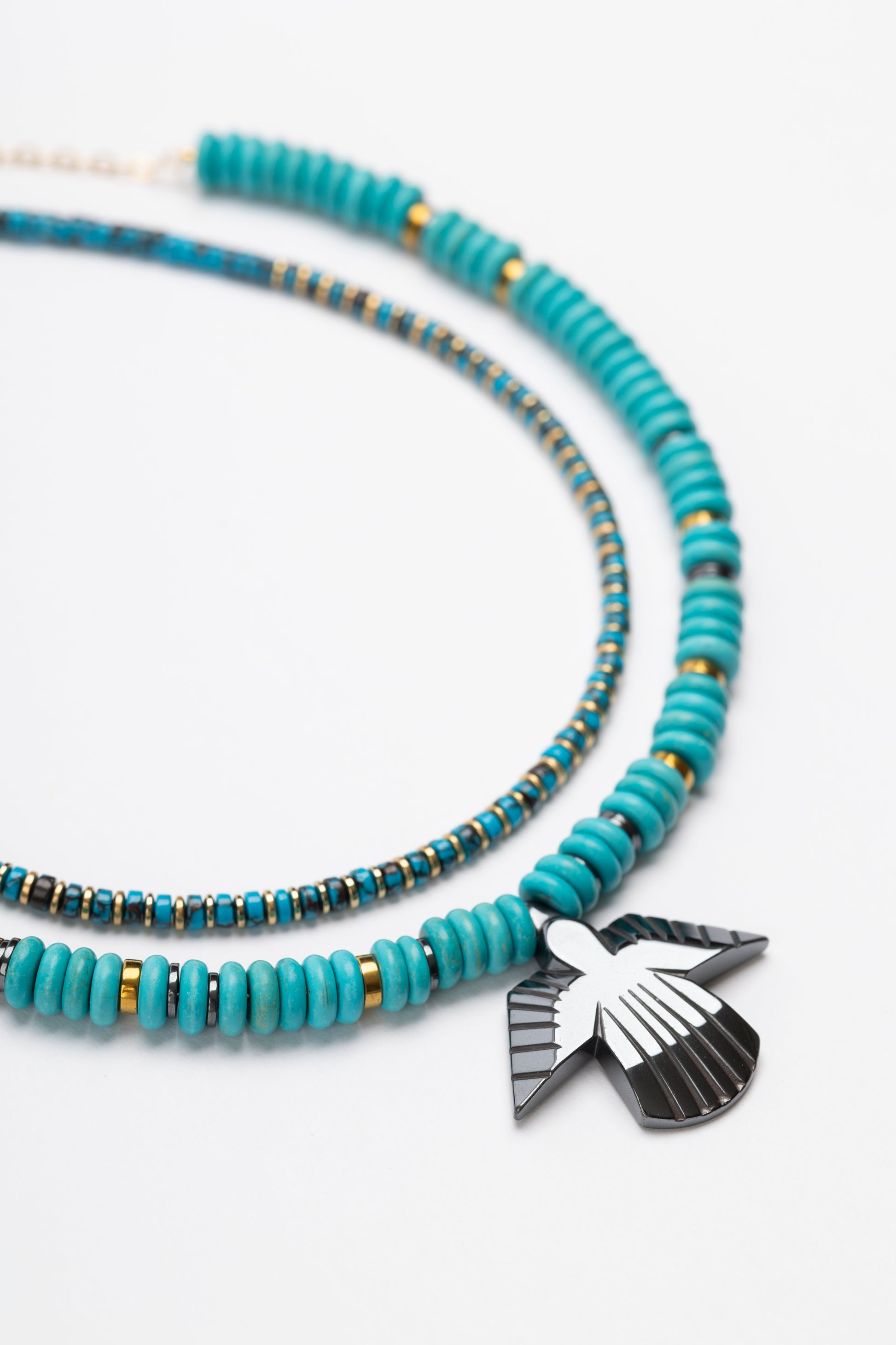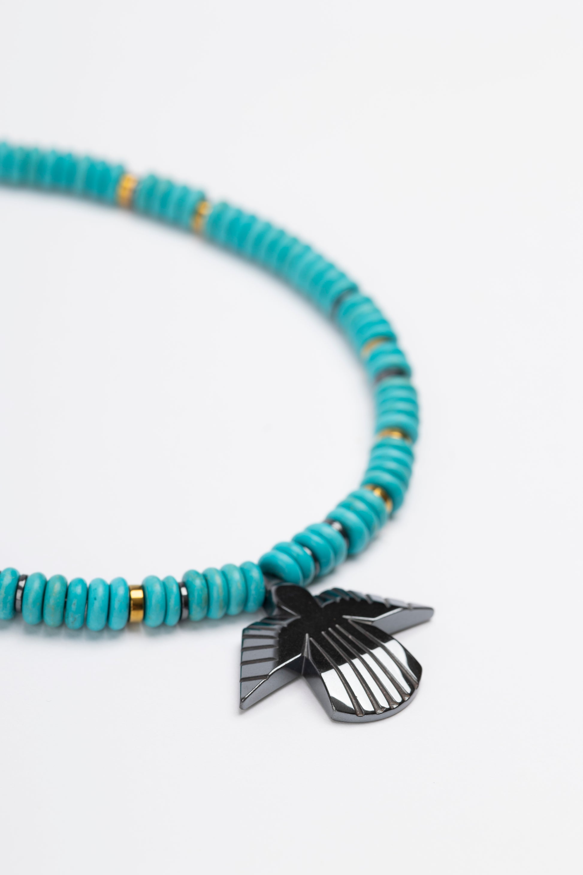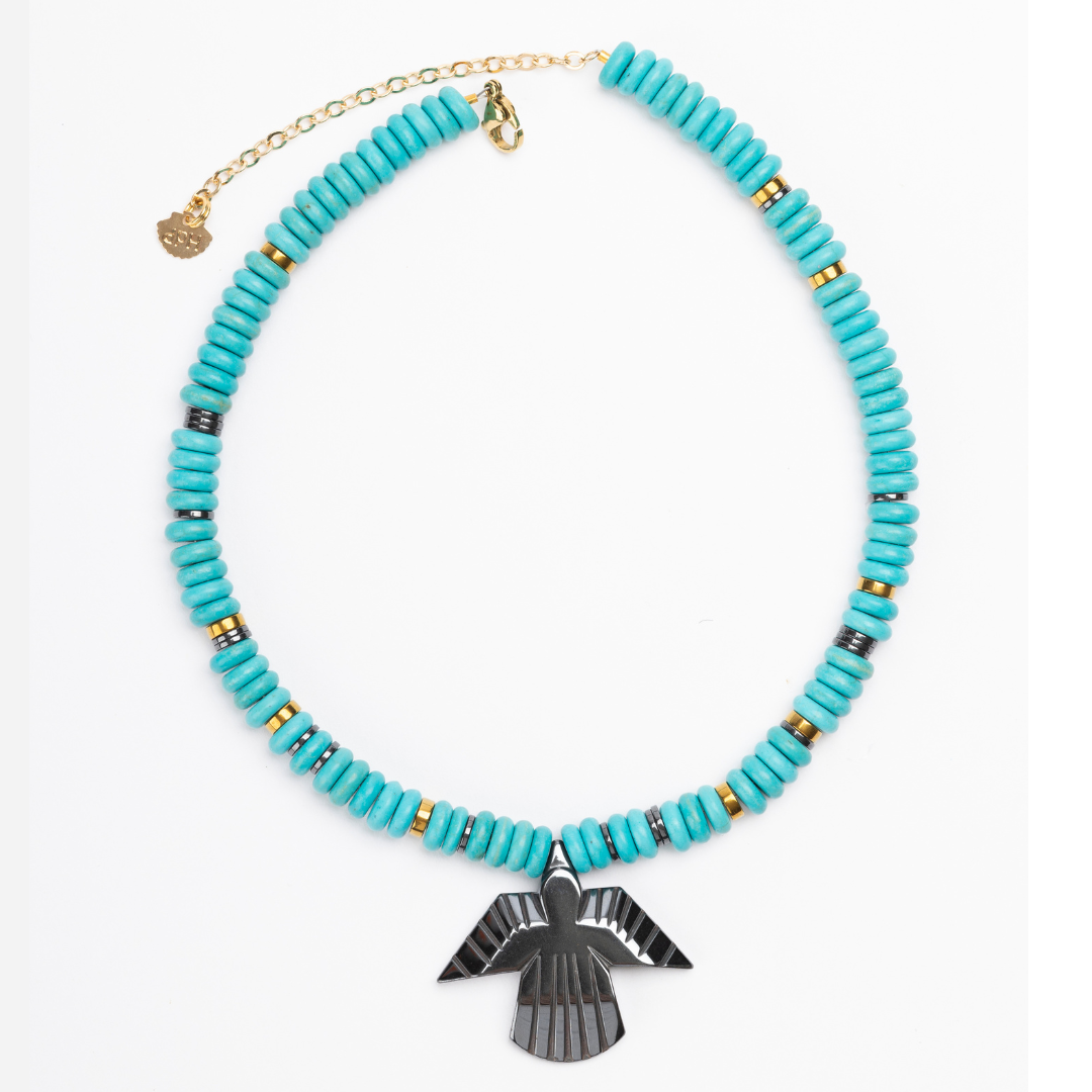 Turquoie Powder Bead Necklace w/ Black Volcanic-Derived Hematite Bird with Golden Volcanic-Derived Hematite Rondelles and Adjustable Gold Plated Brass Cable Chain.