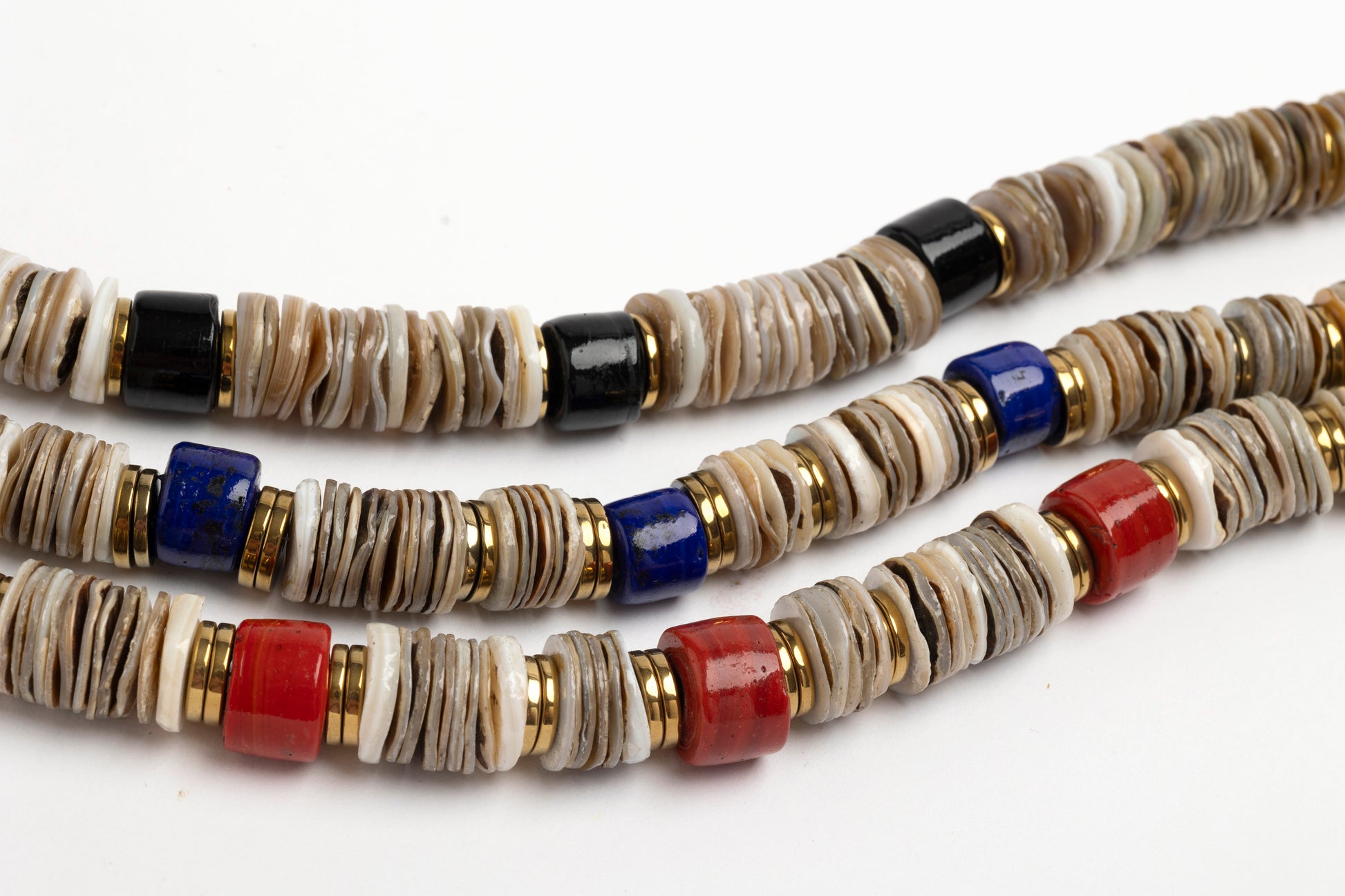 Cream Sea Shell Bead 16mm Necklace with Blue Glass Beads, Golden Volcanic-Derived Hematite Rondelles and Adjustable Gold Plated Brass Cable Chain.