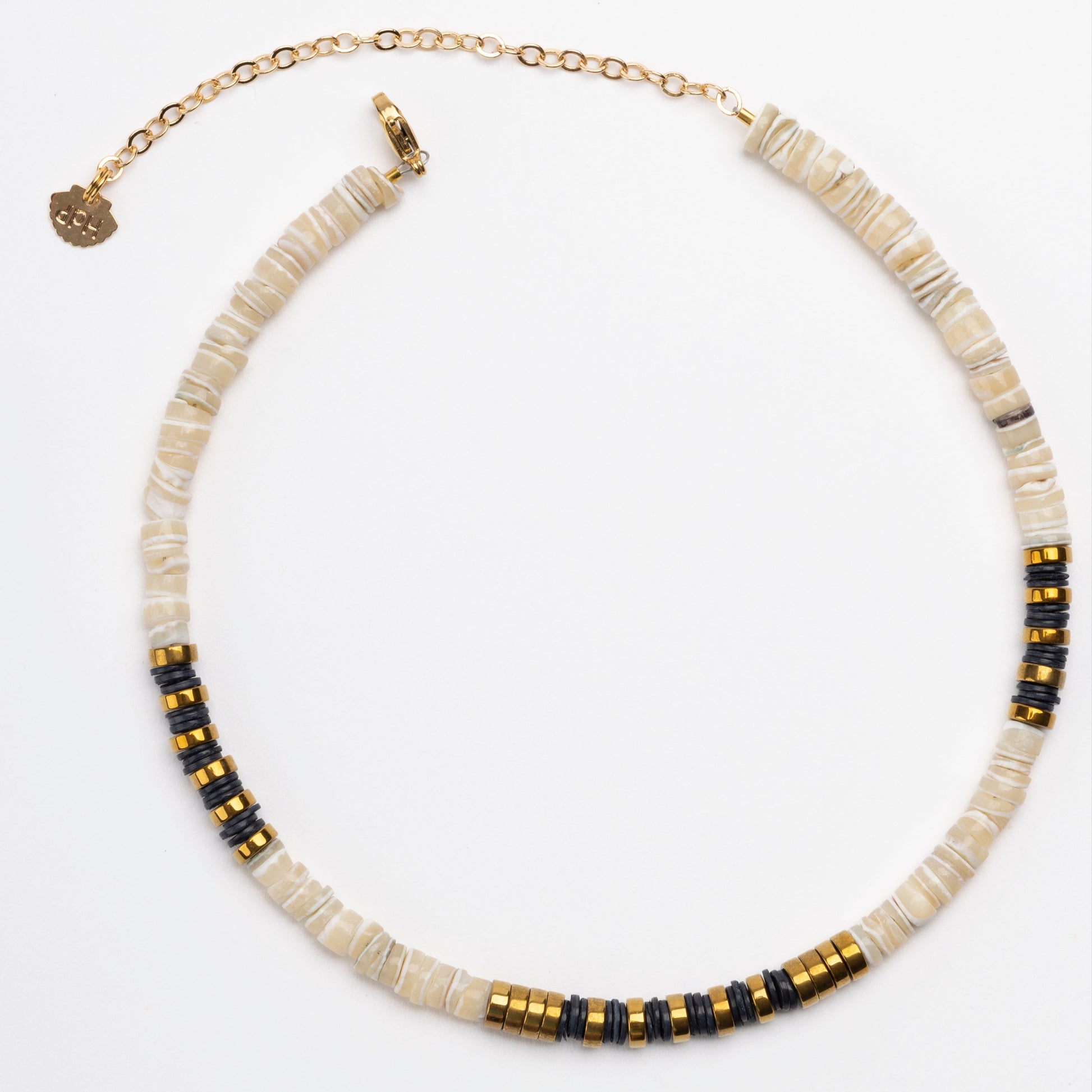 Cream/Grey Shell Puka Necklace with Golden Volcanic-Derived Hematite Rondelles and Adjustable Gold Plated Brass Cable Chain.