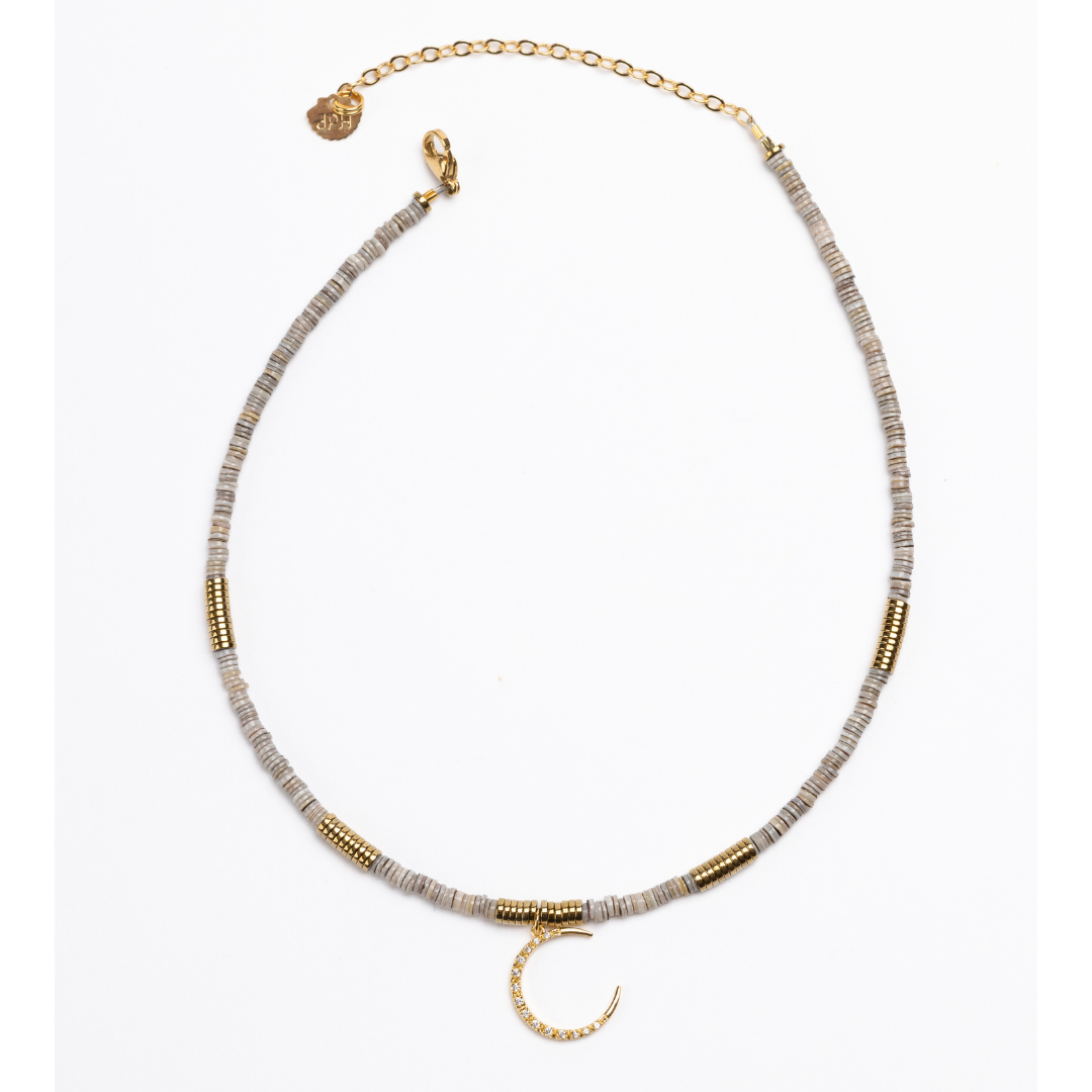 Oyster Shell 3mm Puka Necklace with Micro Pave Cubic Zirconia Moon and Golden Volcanic-Derived Hematite Rondelles and Adjustable Gold Plated Brass Cable Chain.