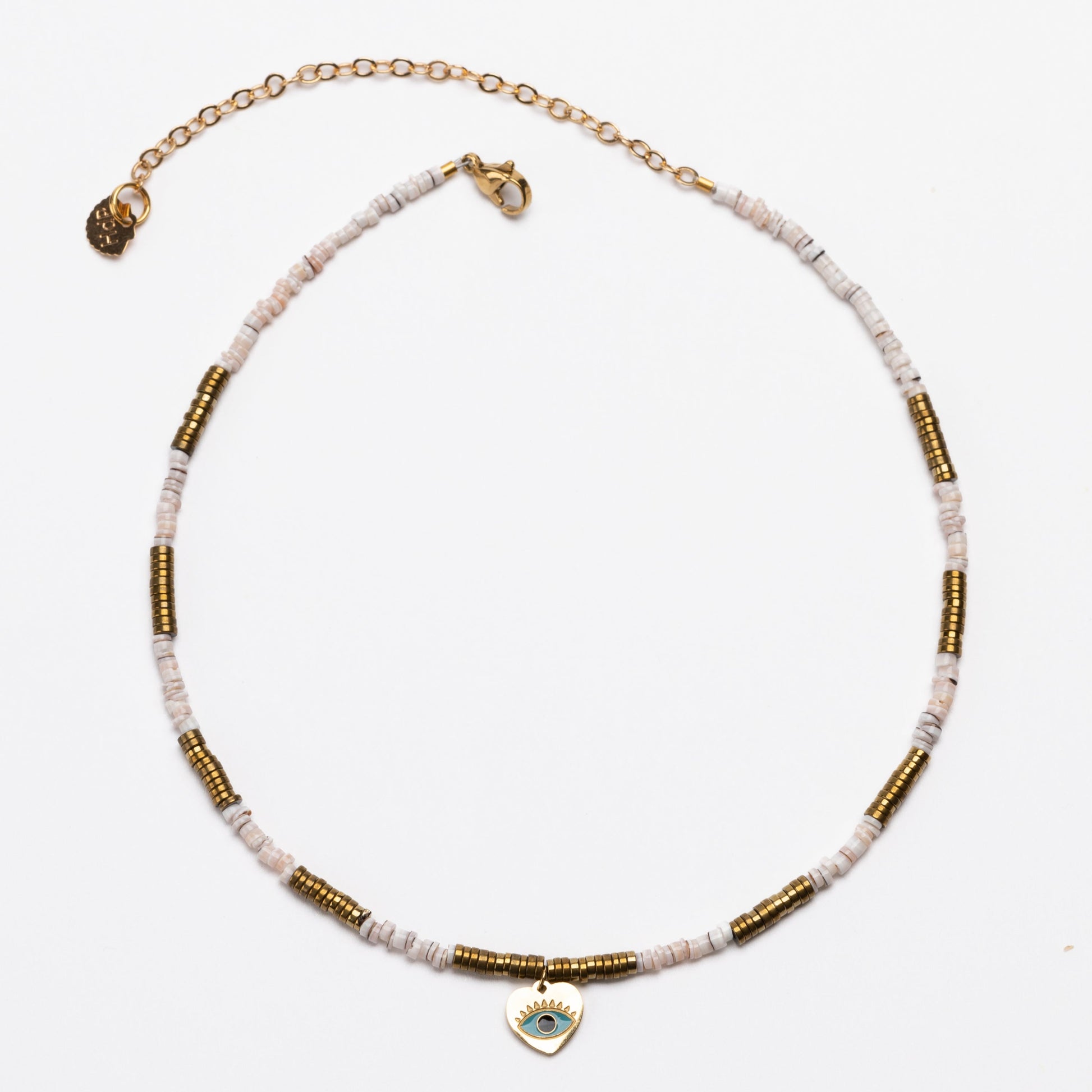 White Sea Shell 3mm Puka Necklace with Enamel Eye Pendant and Golden Volcanic-Derived Hematite Rondelles and Adjustable Gold Plated Brass Cable Chain.
