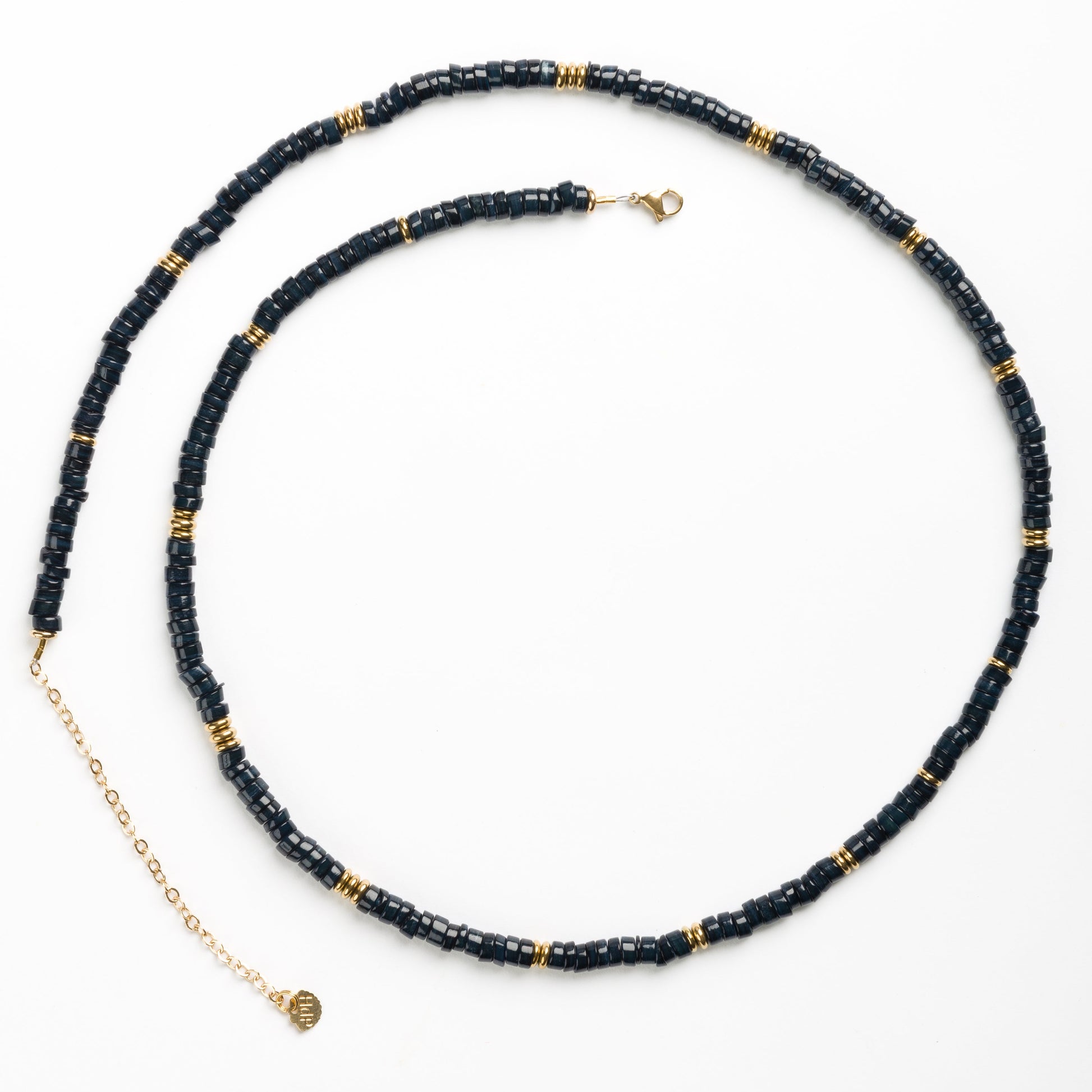 Black Sea Shell Ultra Long Neclkace with Golden Volcanic-Derived Hematite Rondelles and Adjustable Gold Plated Brass Cable Chain.