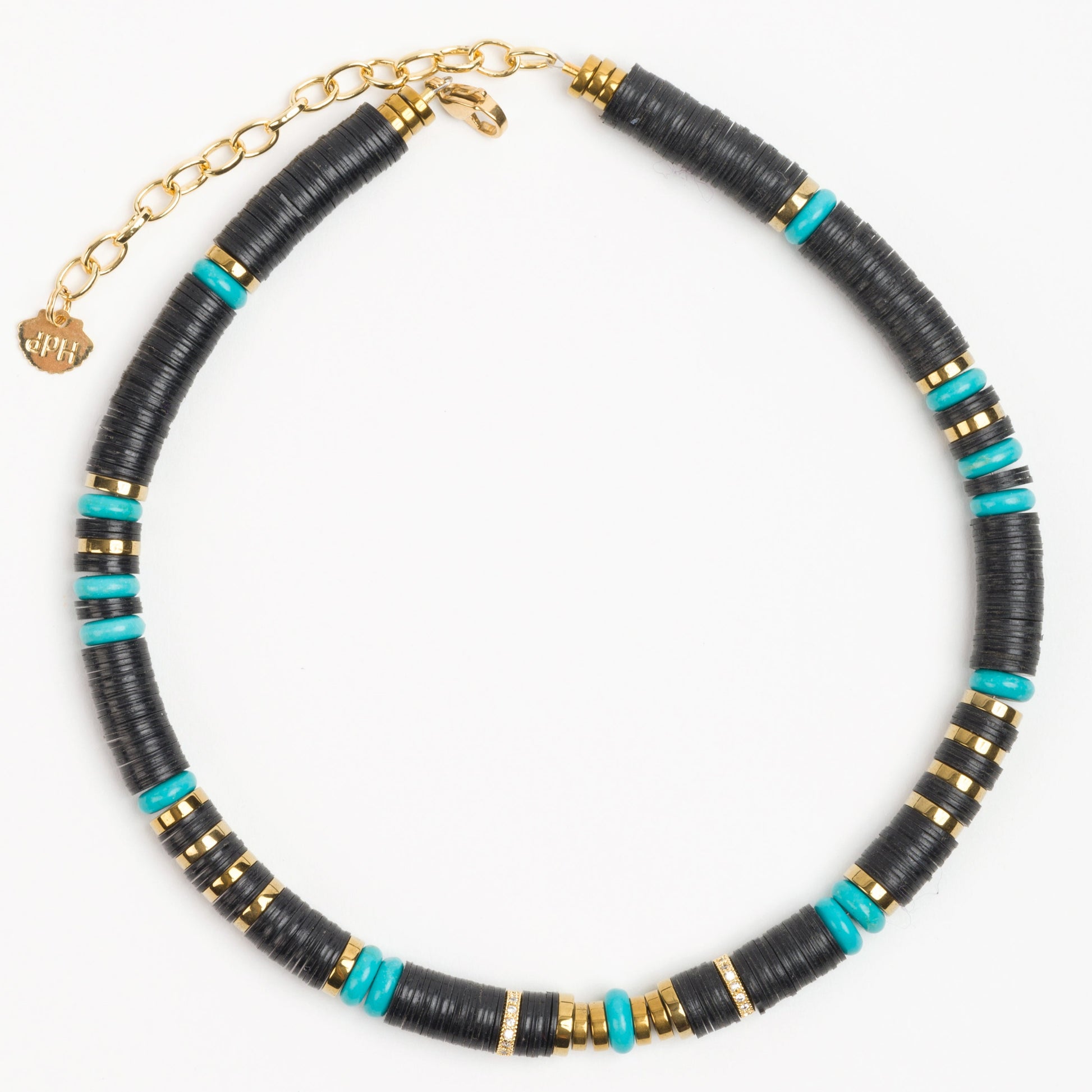 Black 8mm African Bead Necklace with Turqouise Powder Beads, Micro Pave Cubic Zirconia and Golden Volcanic-Derived Hematite Rondelles and Adjustable Gold Plated Brass Cable Chain.