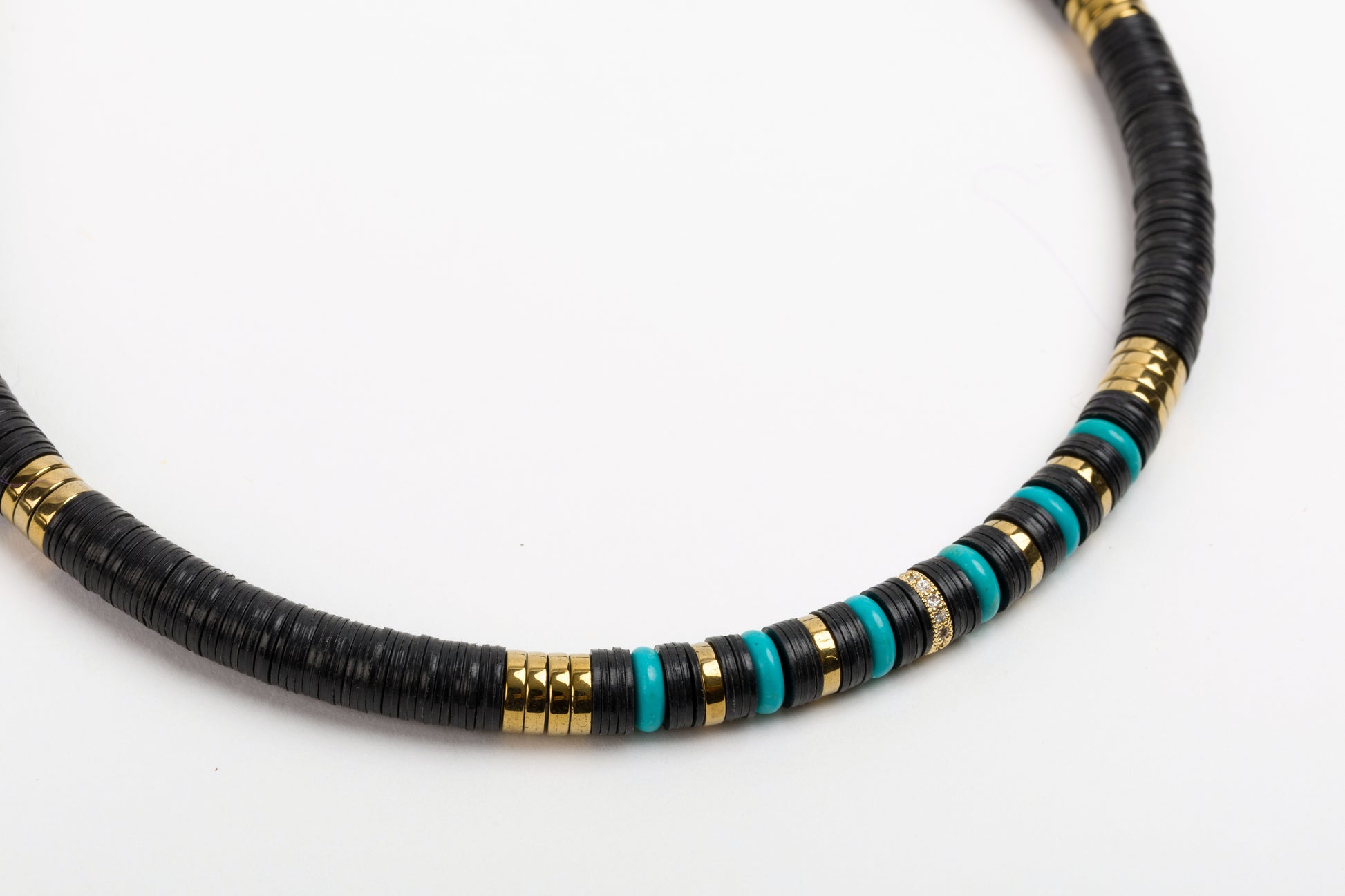 Black 8mm African Bead Necklace with Turqouise Powder Beads, Micro Pave Cubic Zirconia and Golden Volcanic-Derived Hematite Rondelles and Adjustable Gold Plated Brass Cable Chain.