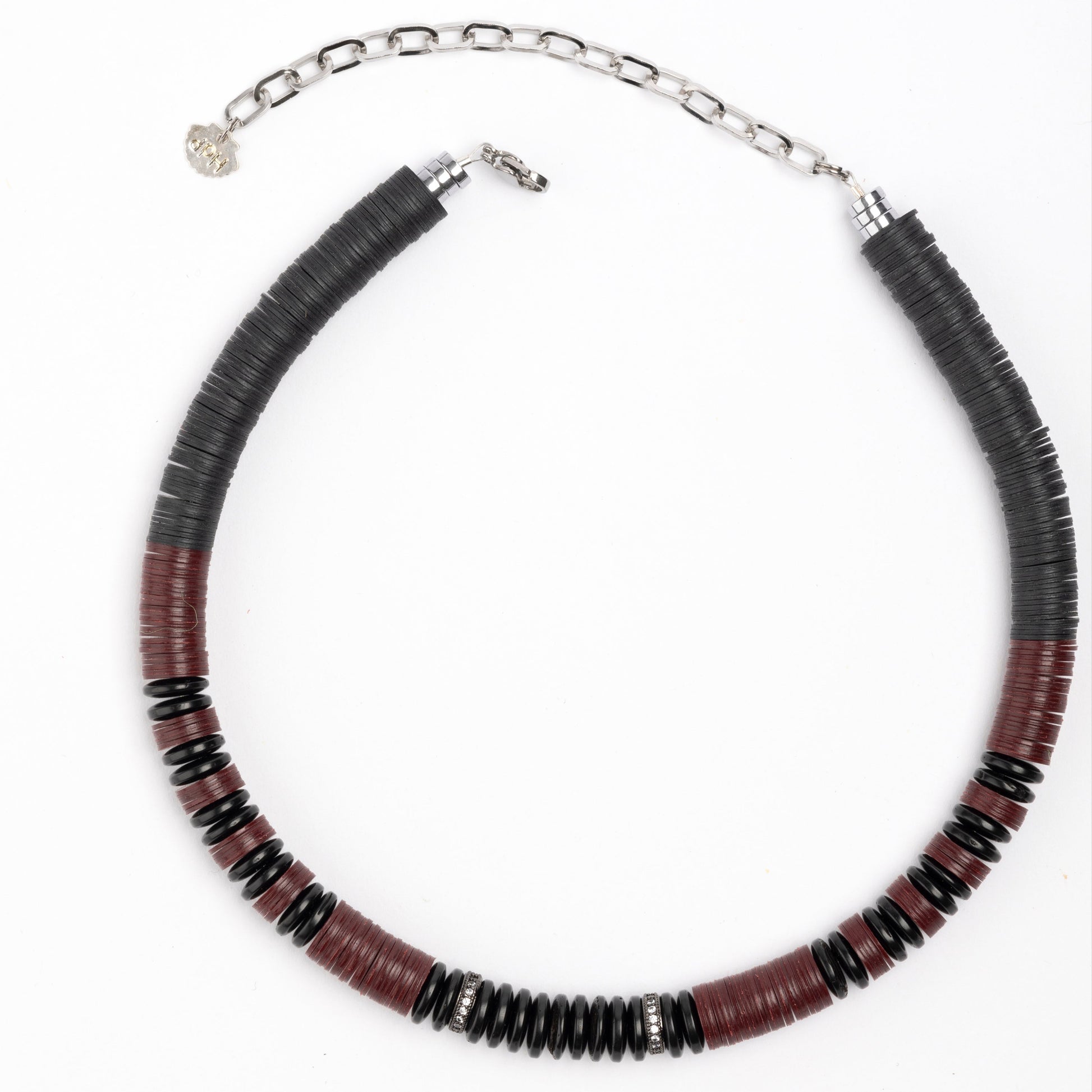 Burgundy/Black 10mm African Bead Necklace with Micro Pave Cubic Zirconia Rondelles and Adjustable Platinum Plated Brass Cable Chain.