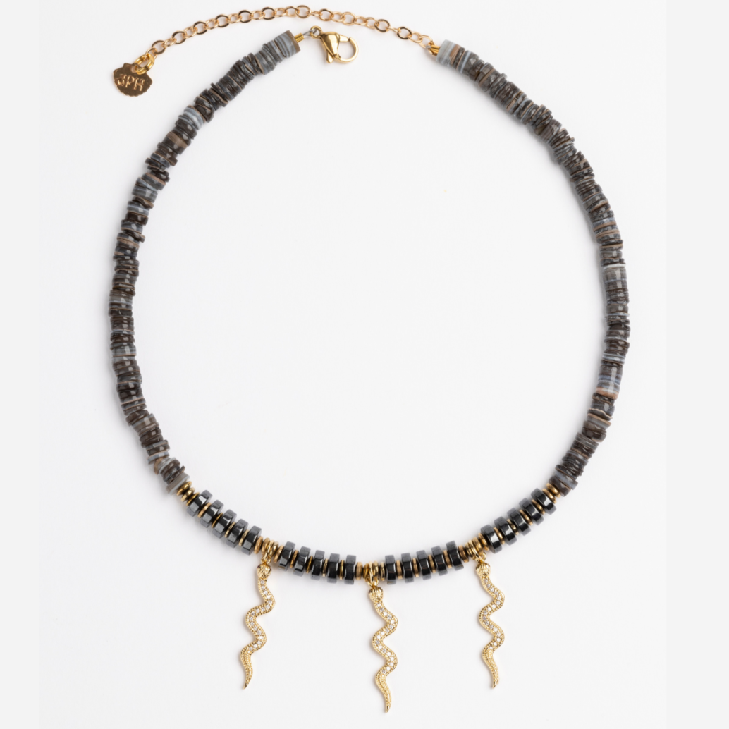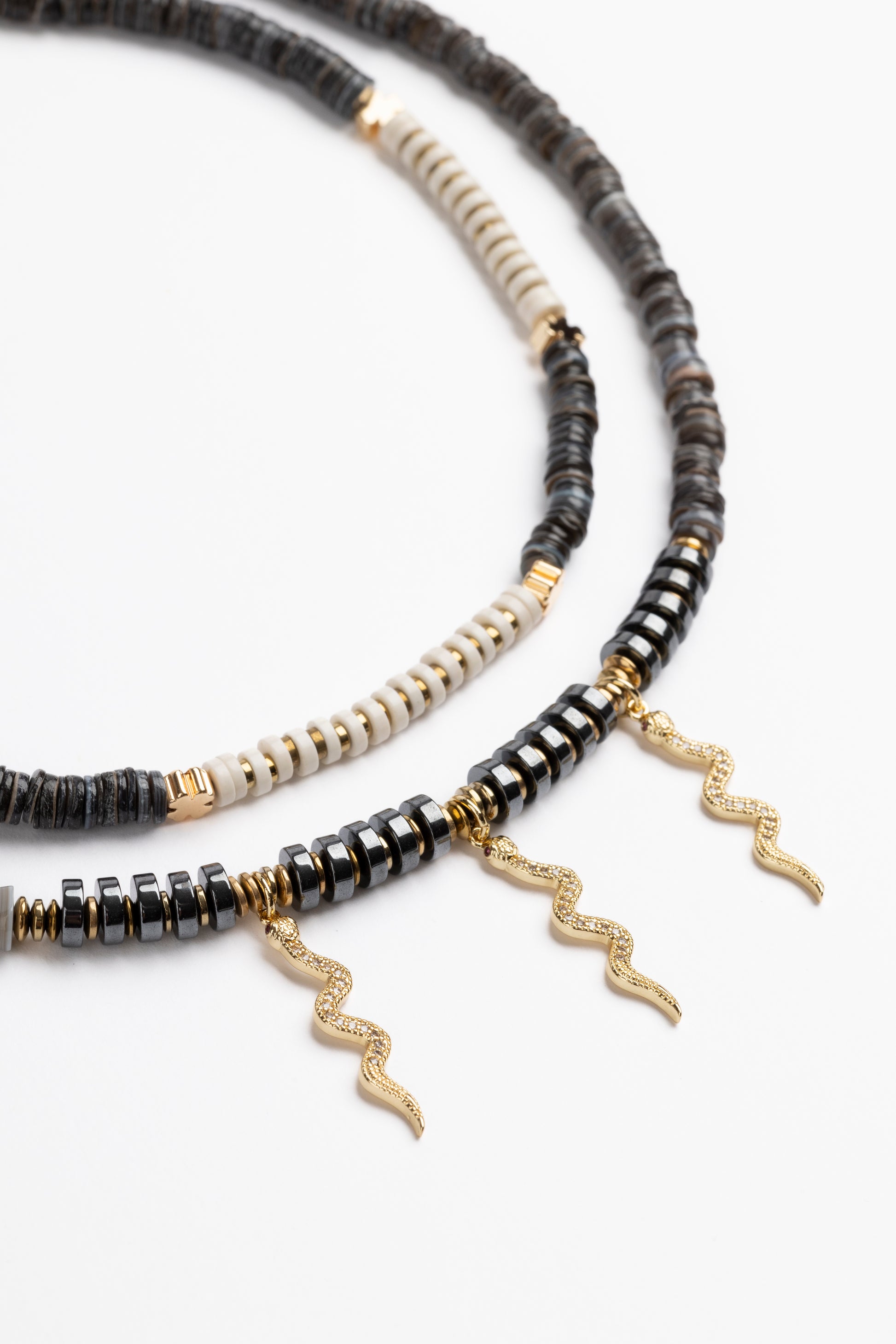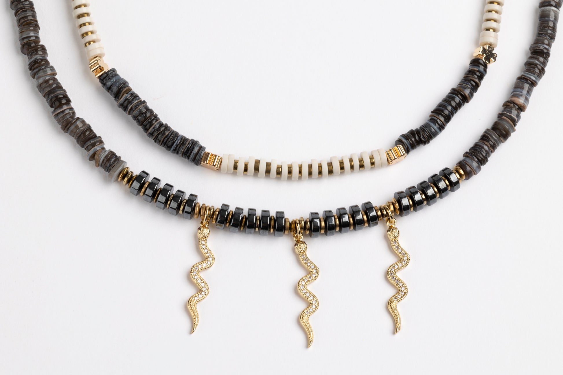 Black Sea Shell Puka Necklace with Micro Pave Cubic Zirconia Snakes, Golden & Black Volcanic-Derived Hematite Rondelles and Adjustable Gold Plated Brass Cable Chain.