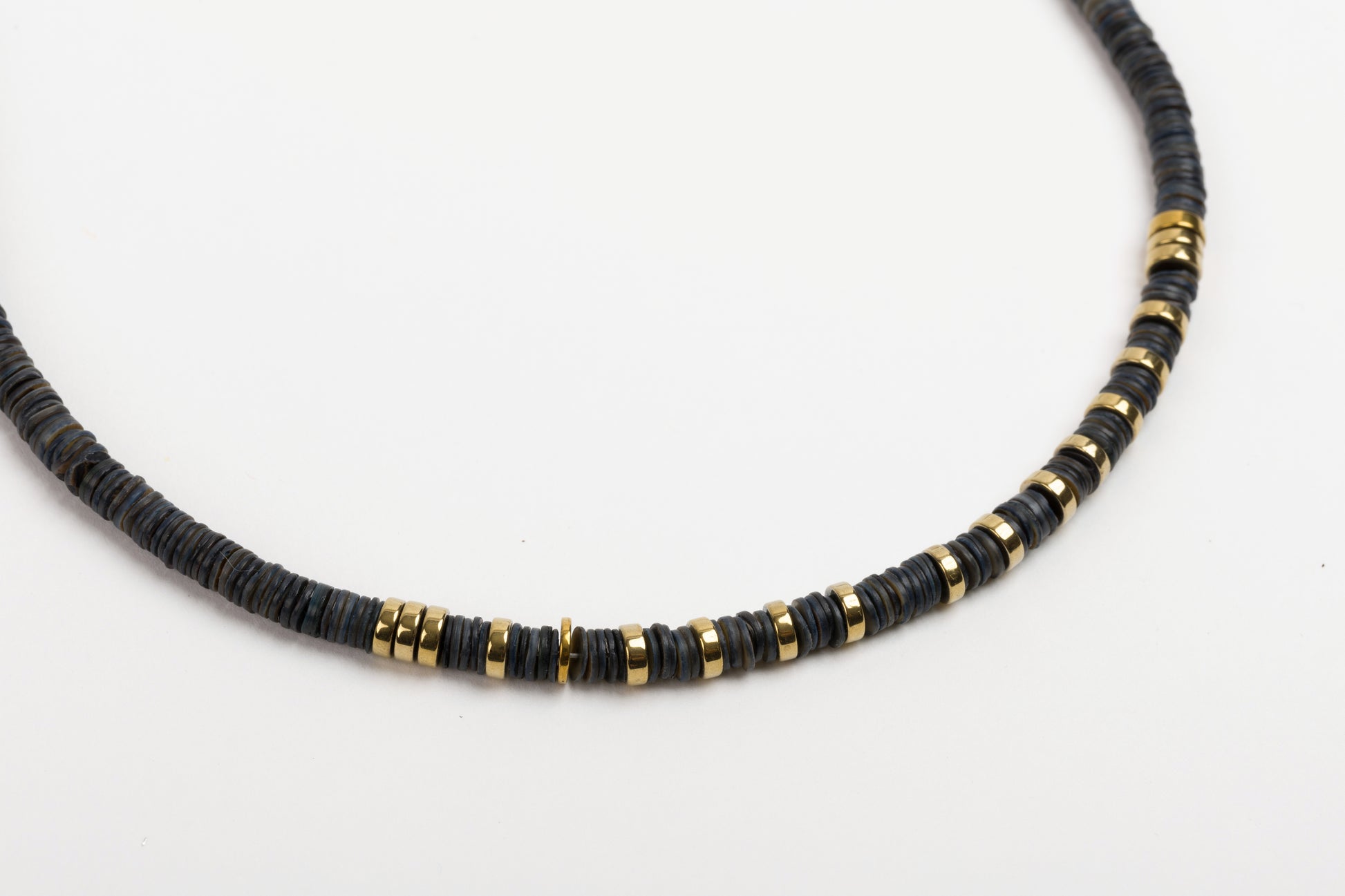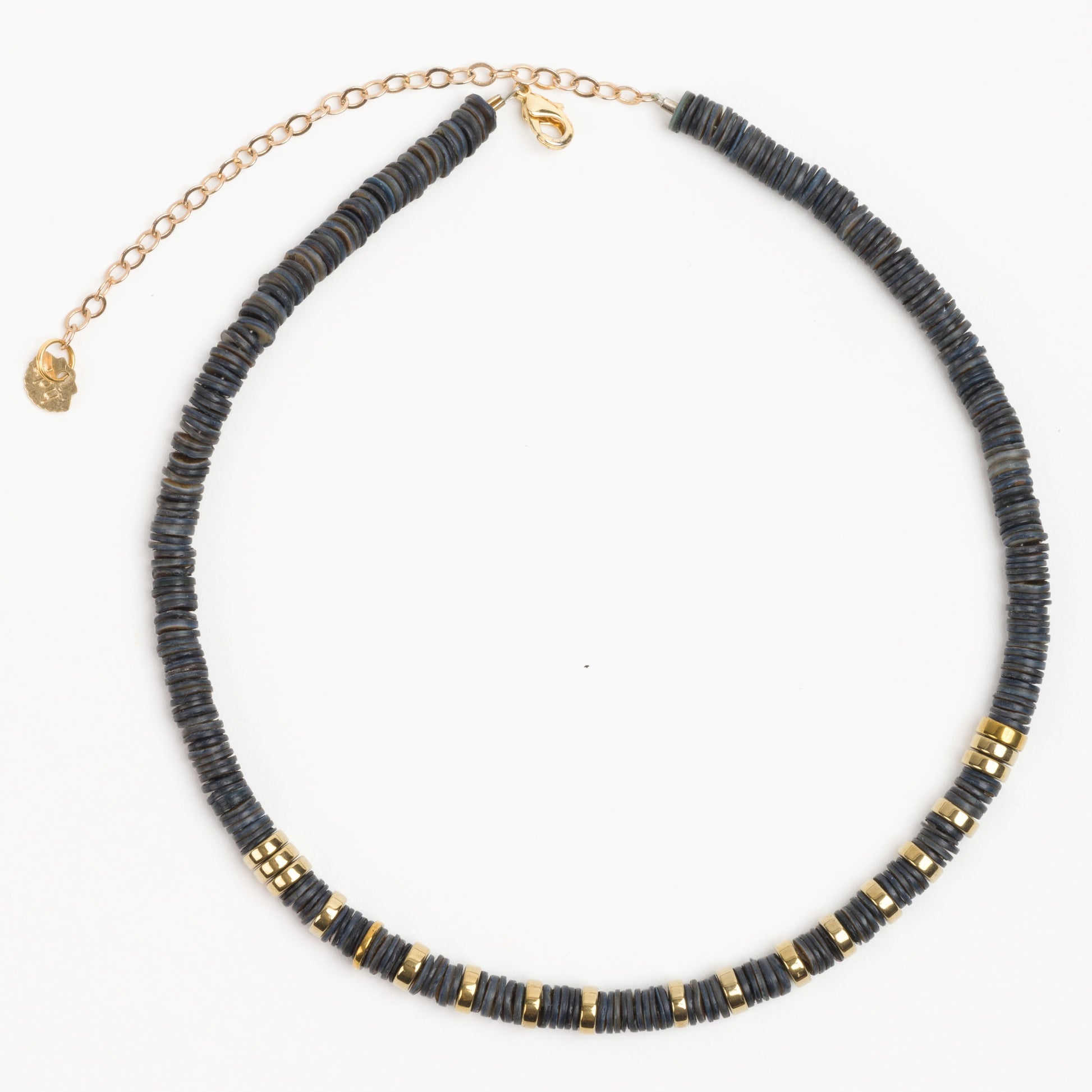 Black Shell Puka Necklace with Golden Volcanic-Derived Hematite Rondelles and Adjustable Gold Plated Brass Cable Chain.