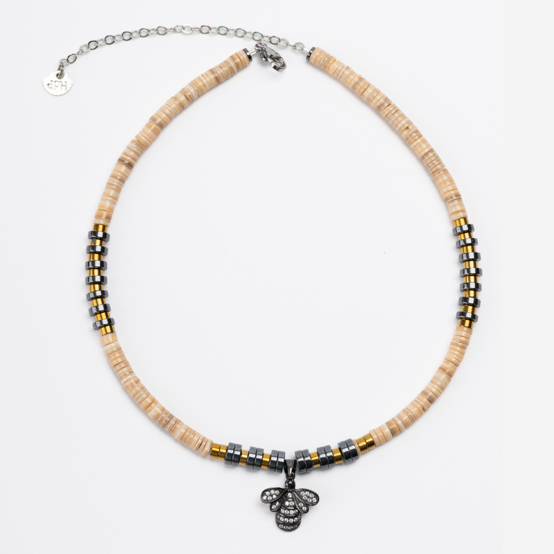 Mustard Shell Puka Necklace with Micro Pave Cubic Zirconia Bee and Black/Gold Volcanic-Derived Hematite Rondelles and Adjustable Platinum Plated Brass Cable Chain.