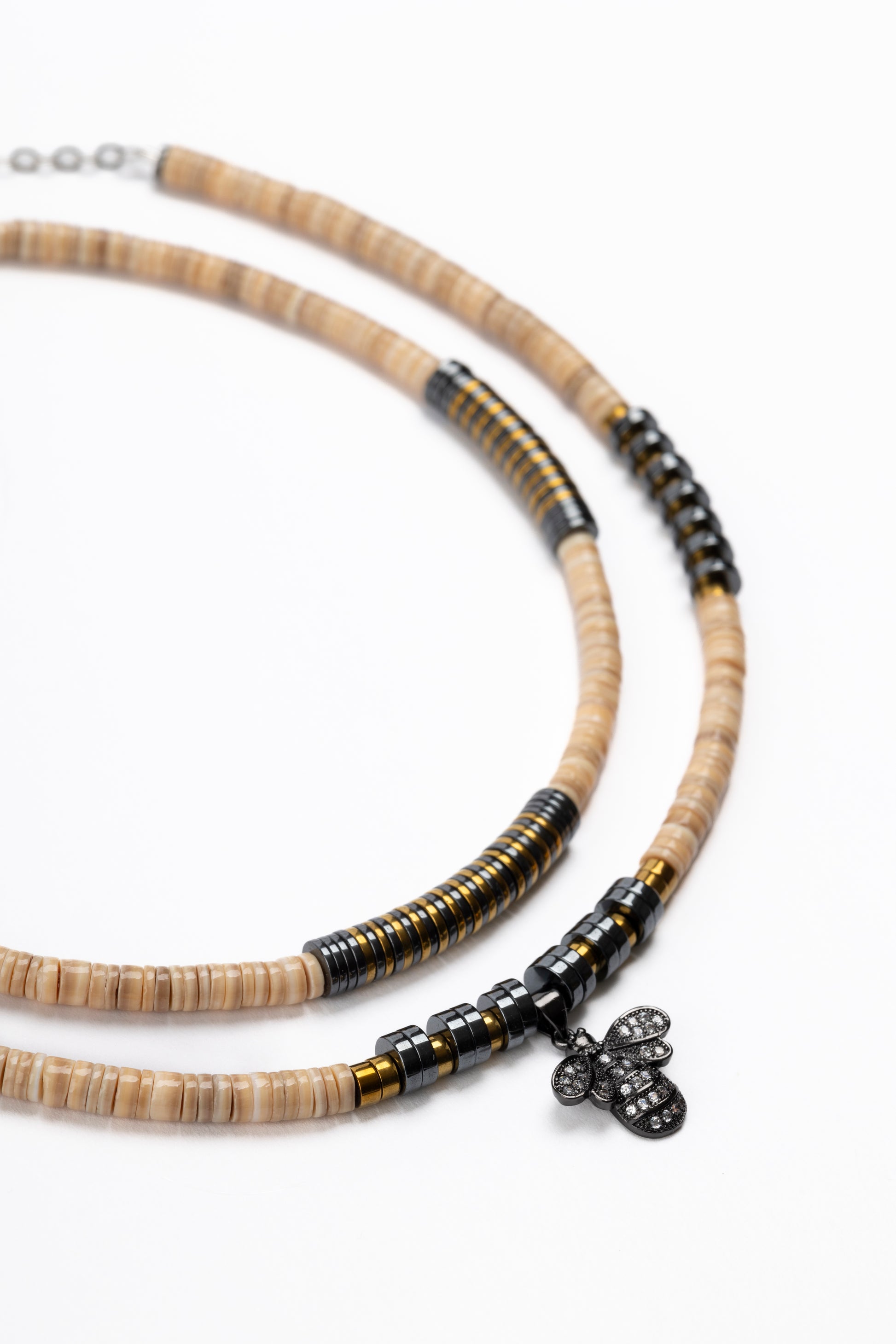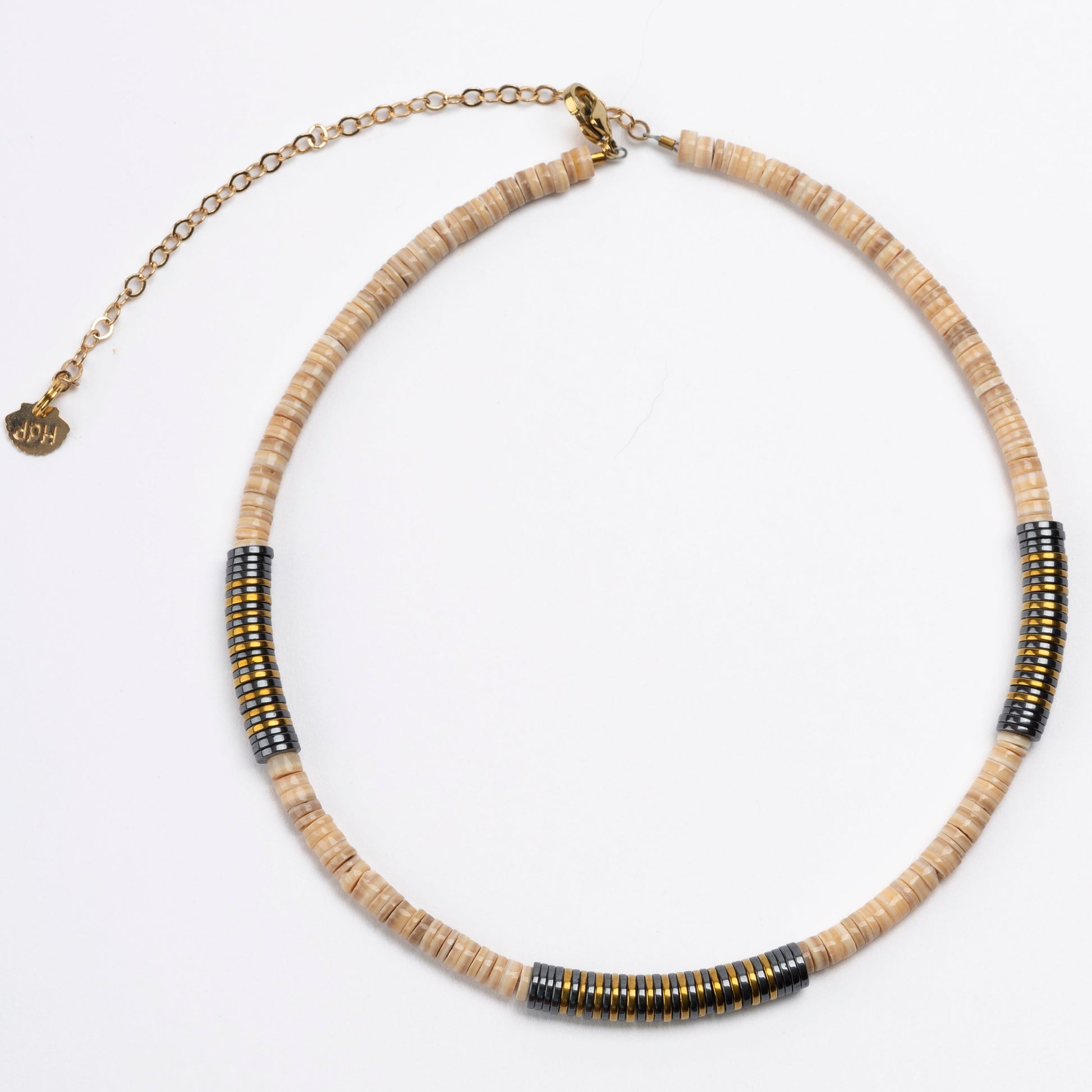 Mustard Shell Puka Necklace with Black and Golden Volcanic-Derived Hematite Rondelles and Adjustable Gold Plated Brass Cable Chain.
