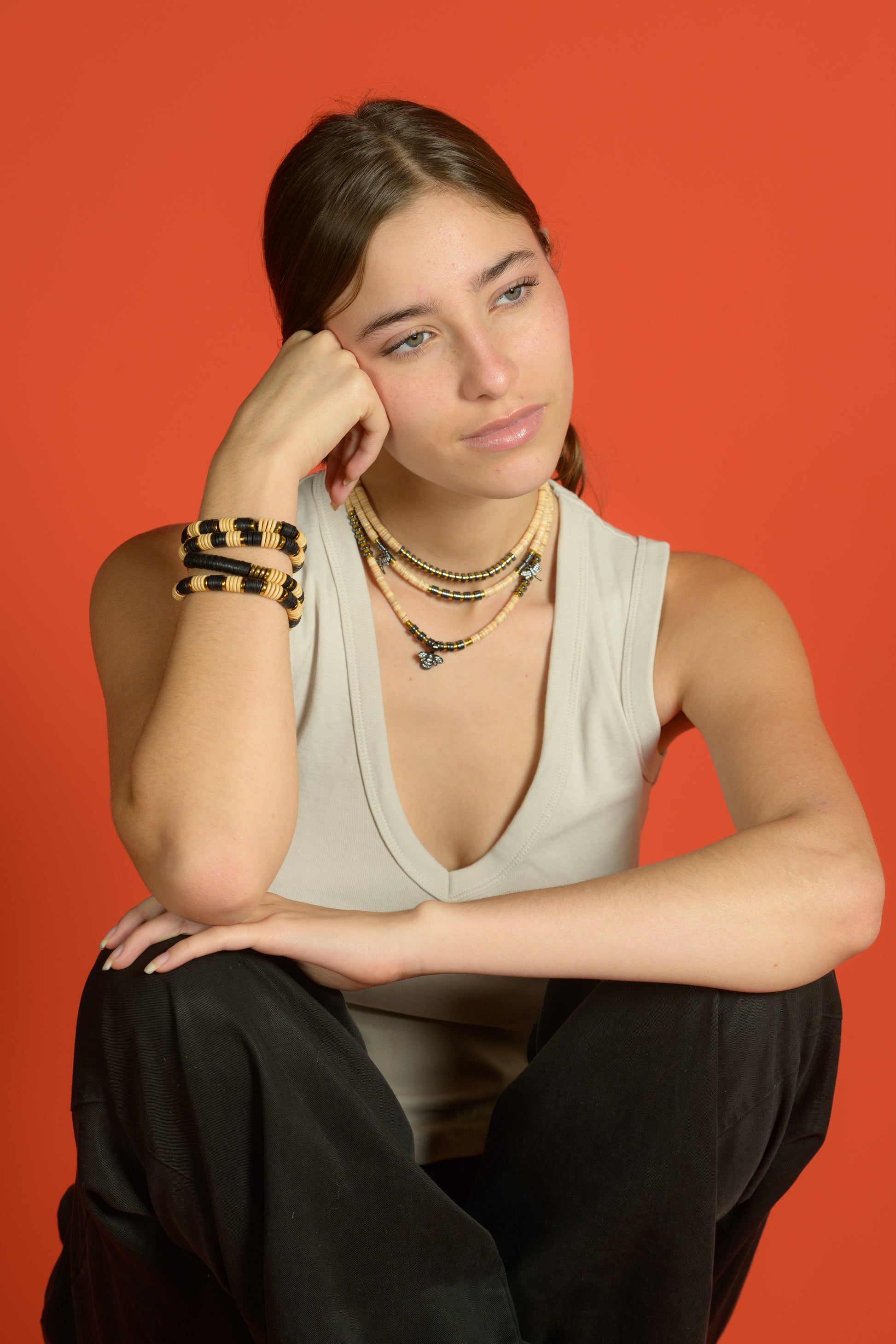 PAULINA is made from Indian volute shells, known for their smooth texture and warm, natural tones. Each piece pairs these earthy shells with sleek hematite and metallic details, creating a look that’s both grounded and refined. Versatile and understated, it’s the kind of collection that works just as well for everyday wear as it does for a night out.