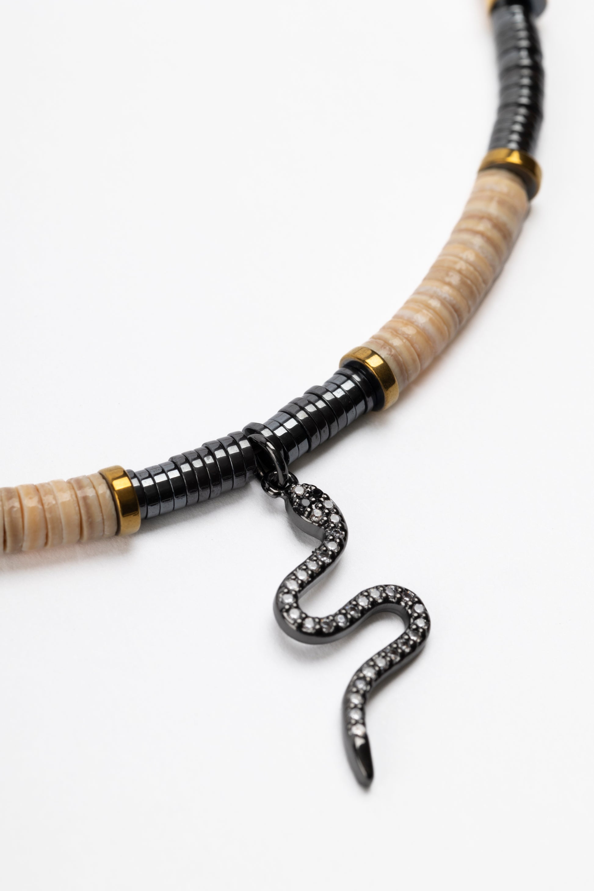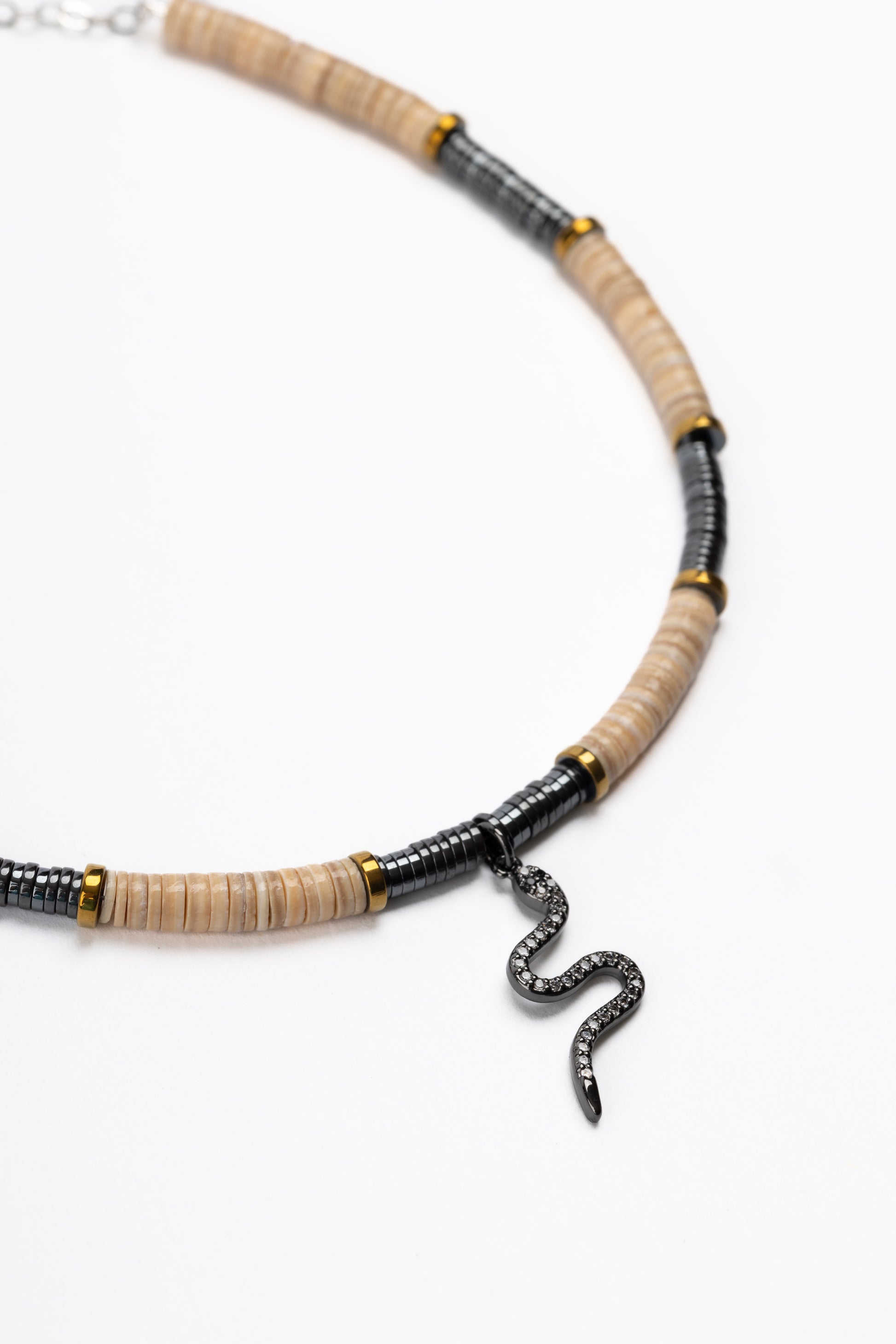 Mustard Shell Puka Necklace with Micro Pave Cubic Zirconia Snake, Black/Gold Volcanic-Derived Hematite Rondelles and Adjustable Platinum Plated Brass Cable Chain.