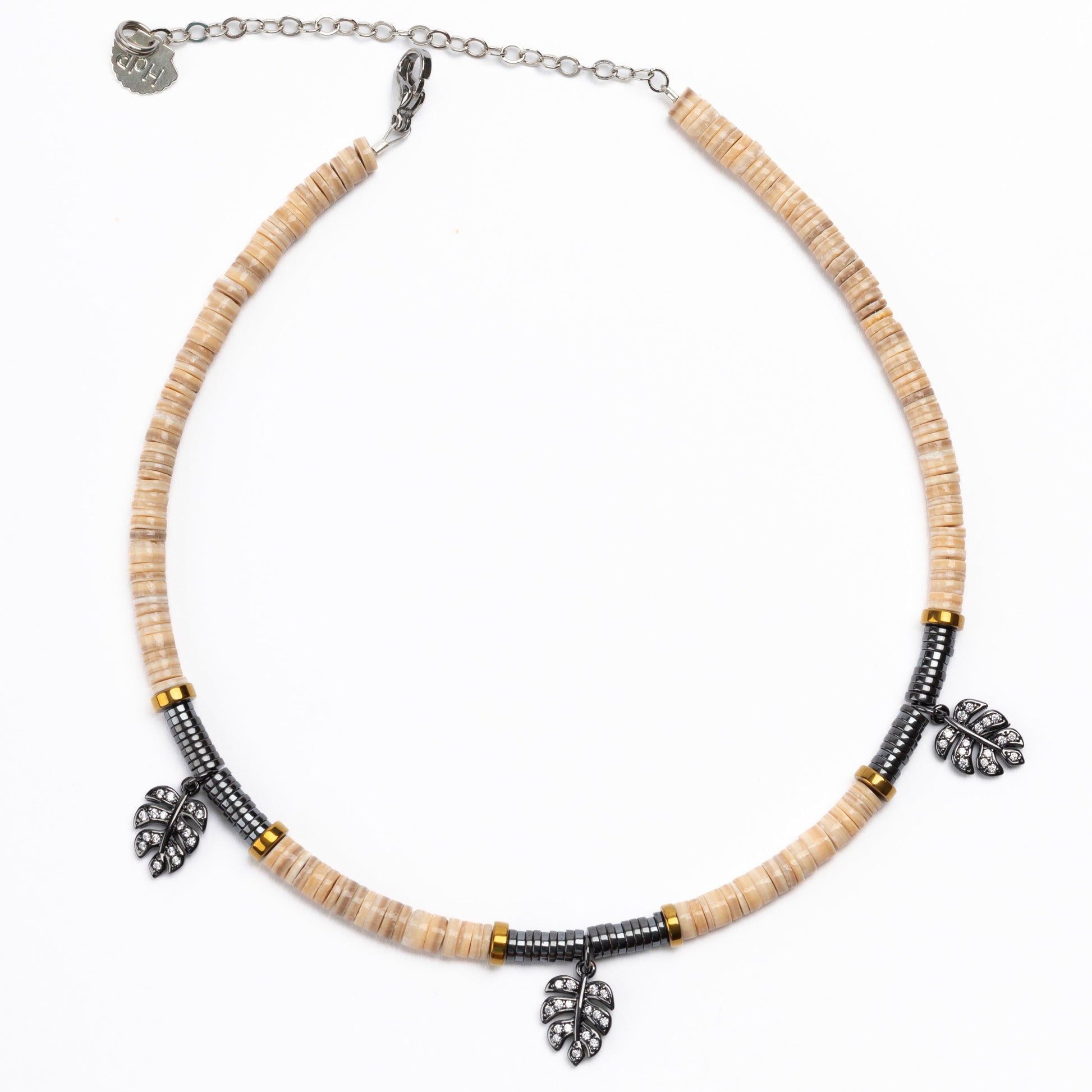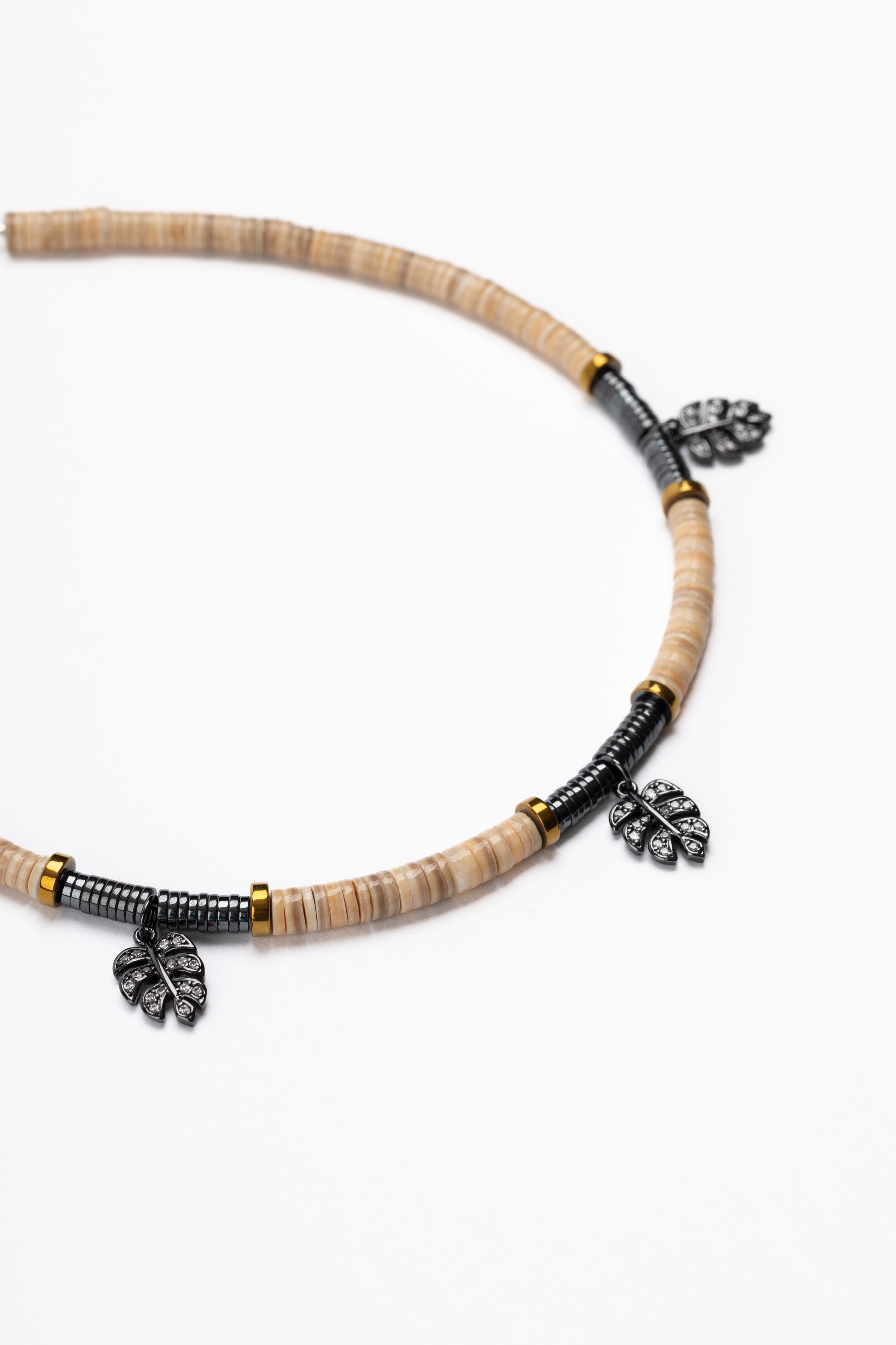 Mustard Shell Puka Necklace with Micro Pave Cubic Zirconia Leaves and Black/Gold Volcanic-Derived Hematite Rondelles and Adjustable Platinum Plated Brass Cable Chain.