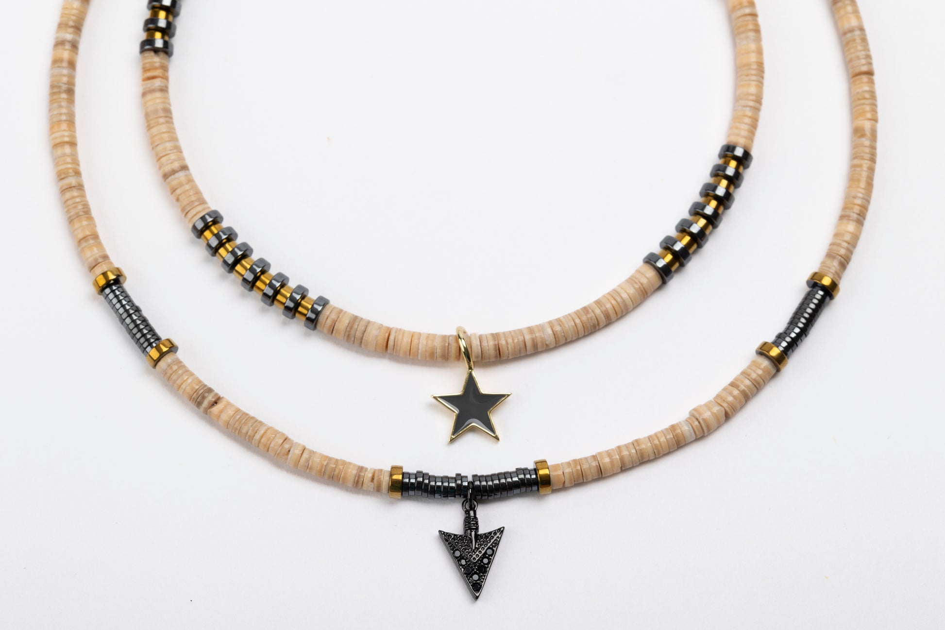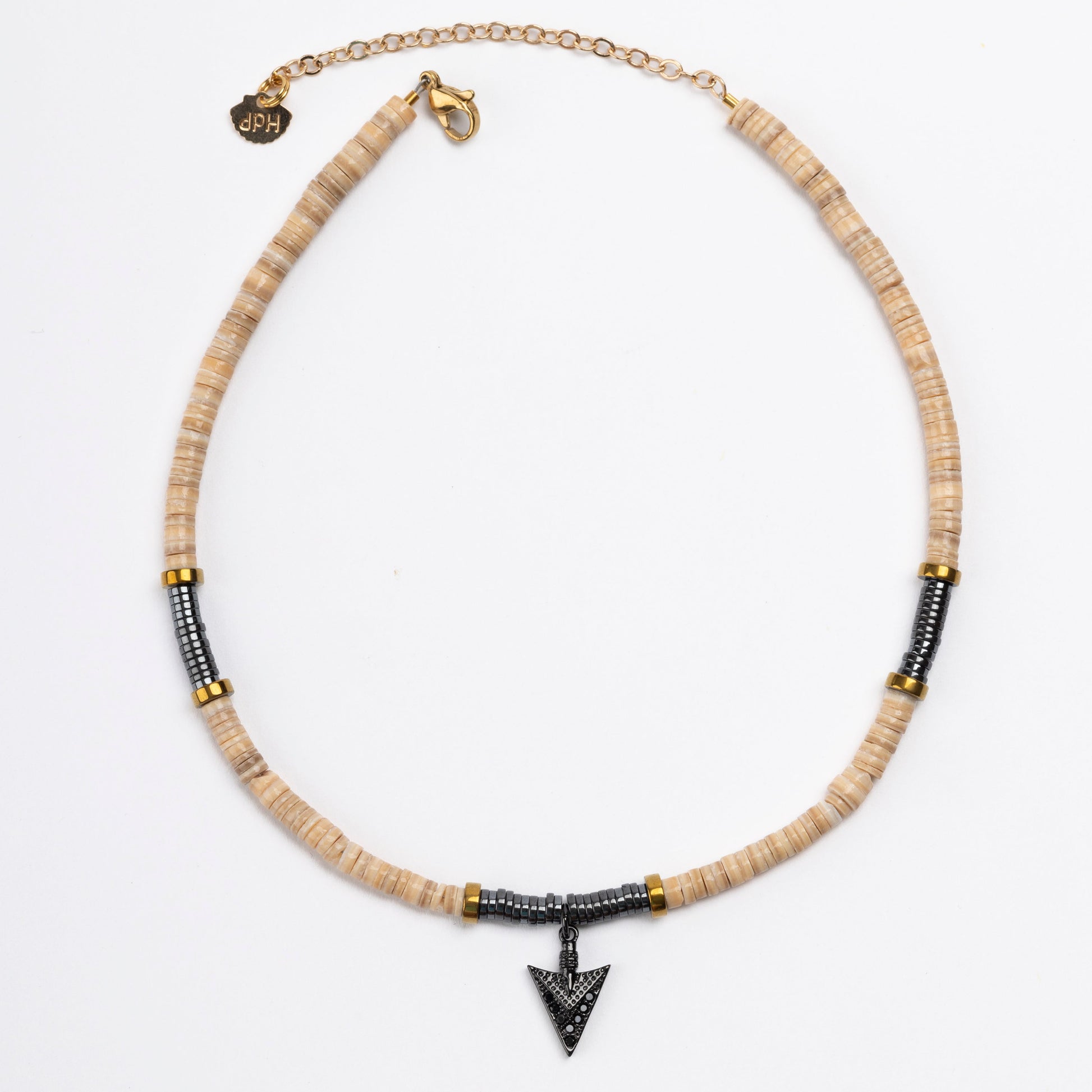 PAULINA is made from Indian volute shells, known for their smooth texture and warm, natural tones. Each piece pairs these earthy shells with sleek hematite and metallic details, creating a look that’s both grounded and refined. Versatile and understated, it’s the kind of collection that works just as well for everyday wear as it does for a night out.