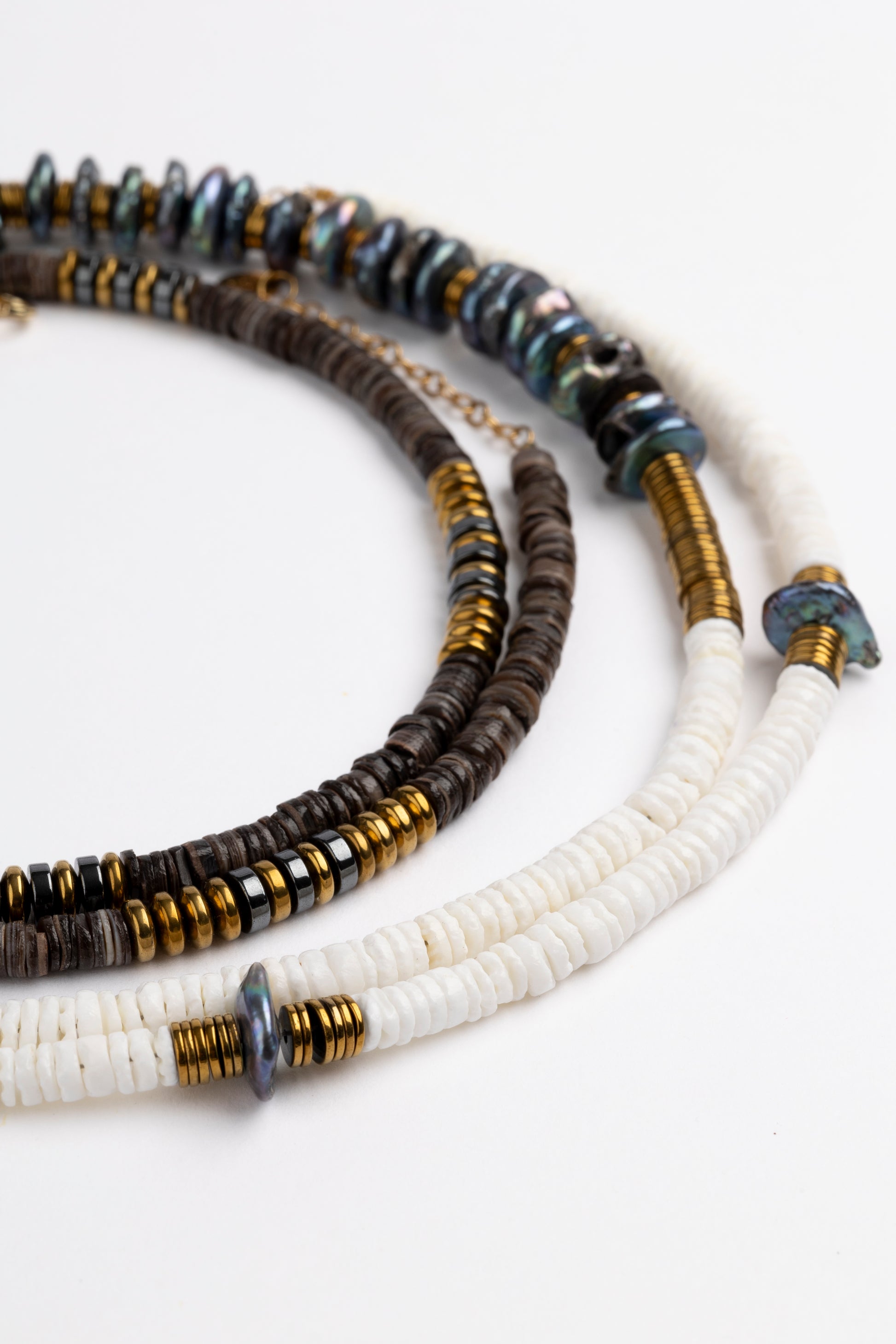 White Long Shell Puka Necklace with Golden Volcanic-Derived Hematite Rondelles and Adjustable Gold Plated Brass Cable Chain.