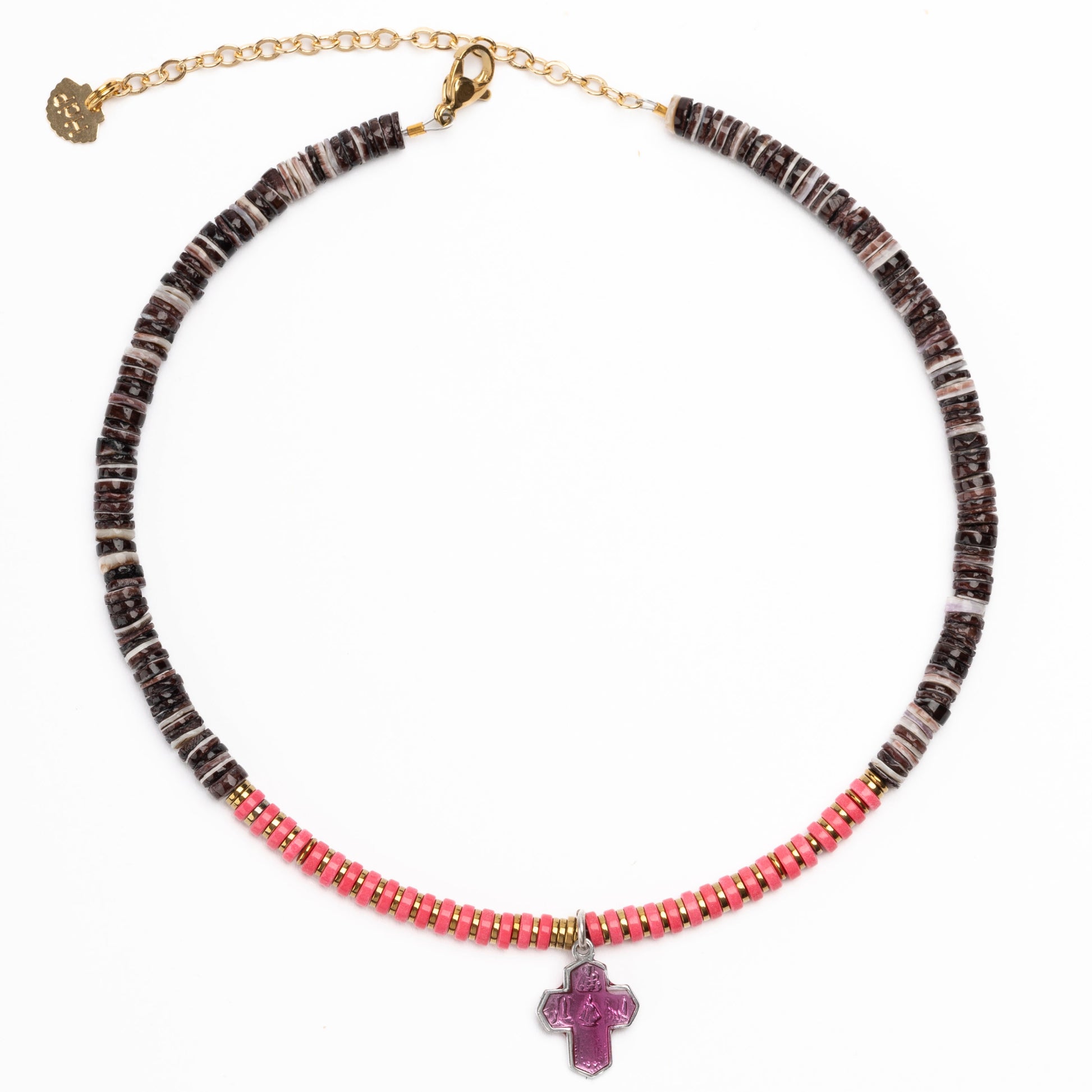 Oyster Sea Shell Puka Necklace with Aluminum Epoxy Enamel Cross Medal, Pink Natural Agate Beads, Golden Volcanic-Derived Hematite Rondelles and Adjustable Gold Plated Brass Cable Chain.