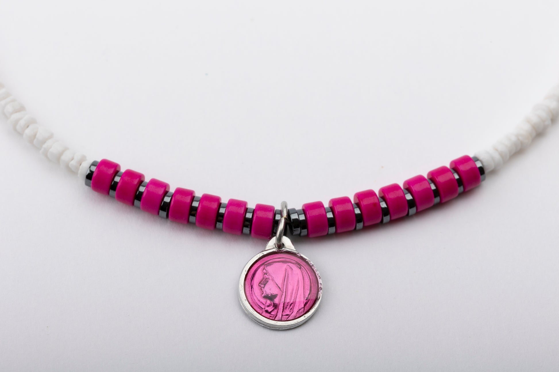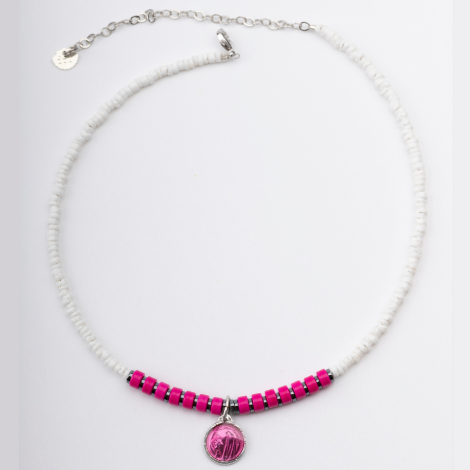 White Sea Shell Puka Necklace with Aluminum Epoxy Enamel Virgin Medal, Synthetic Turquoise Beads, Black Volcanic-Derived Hematite Rondelles and Adjustable Platinum Plated Brass Cable Chain.