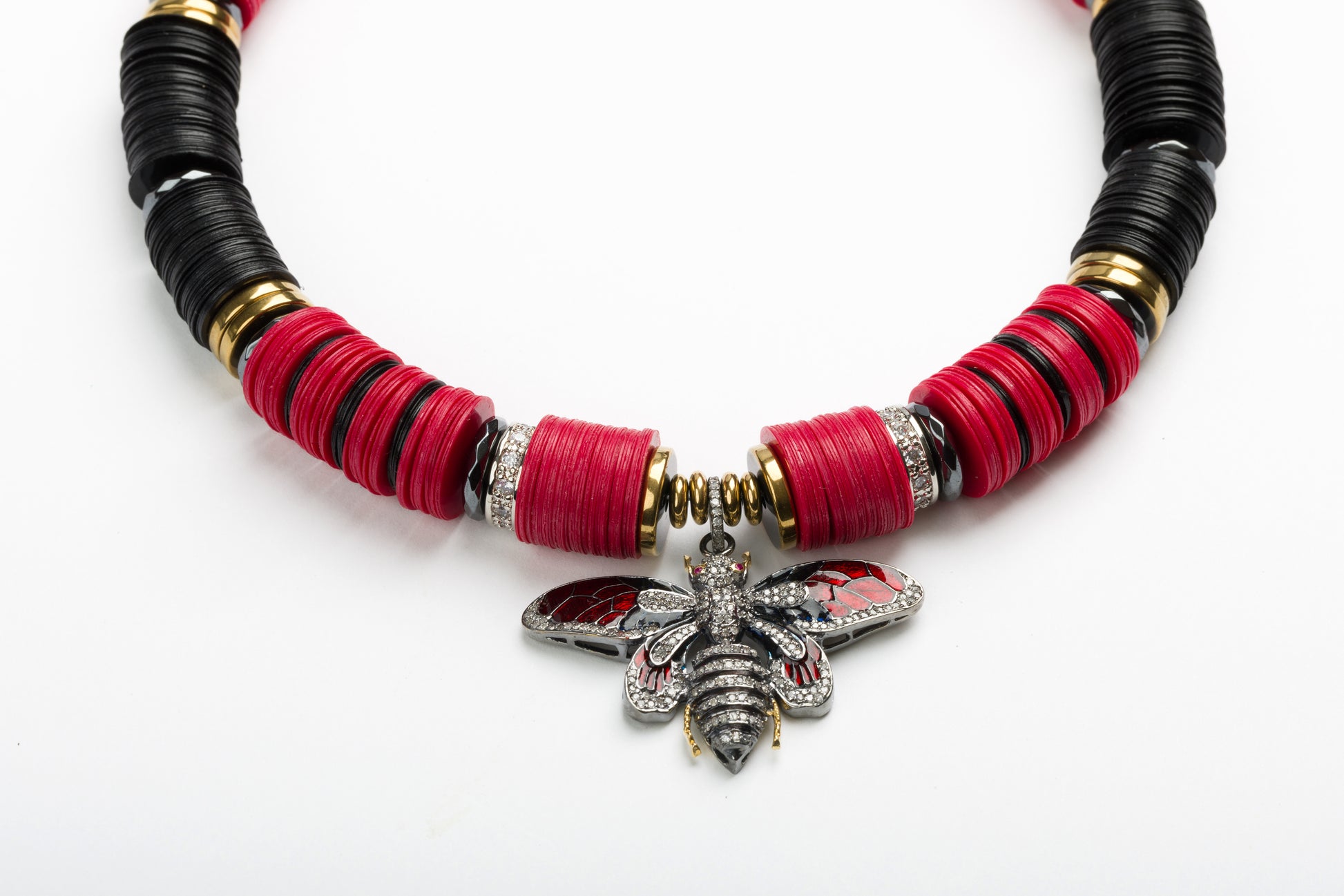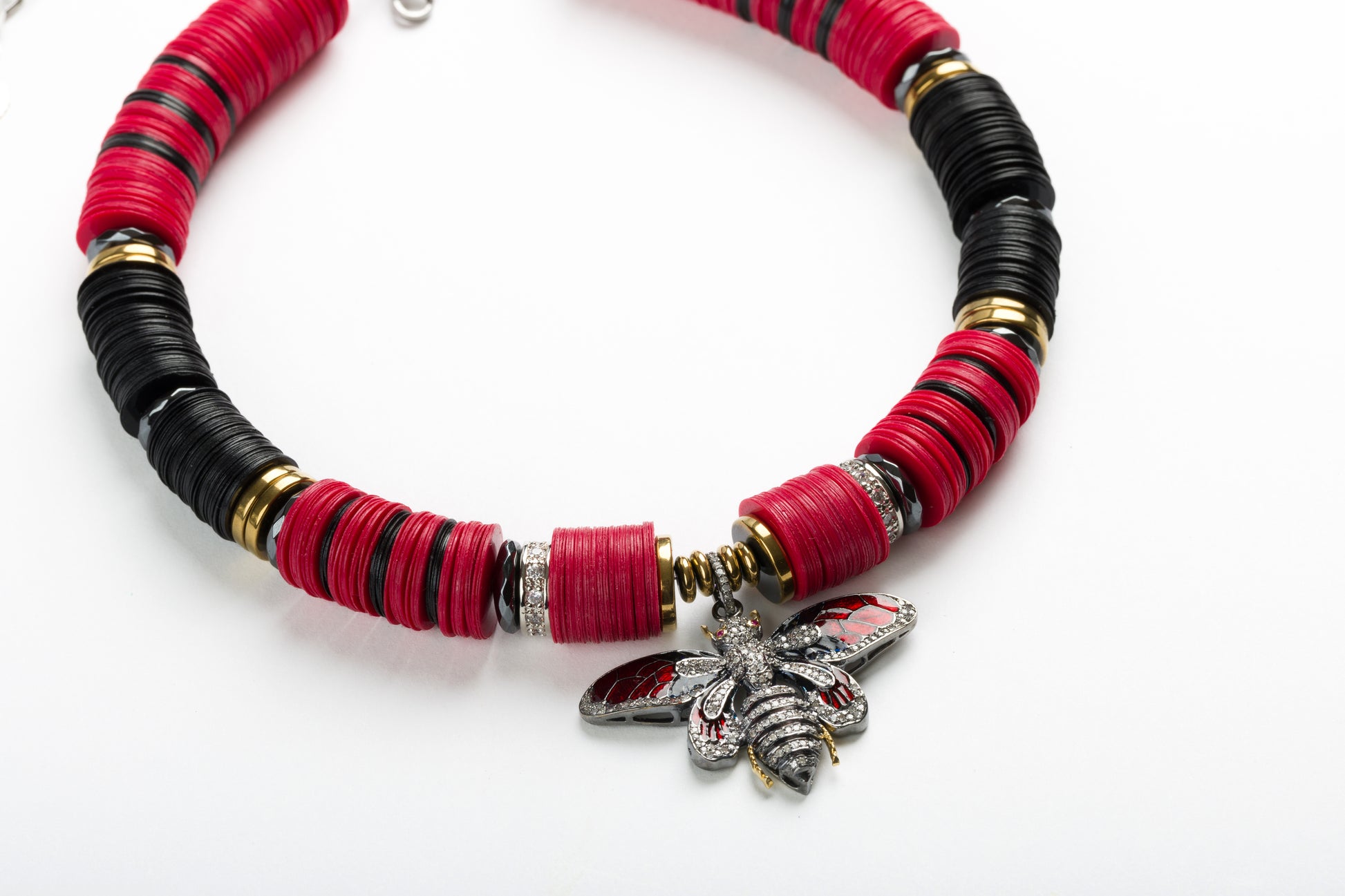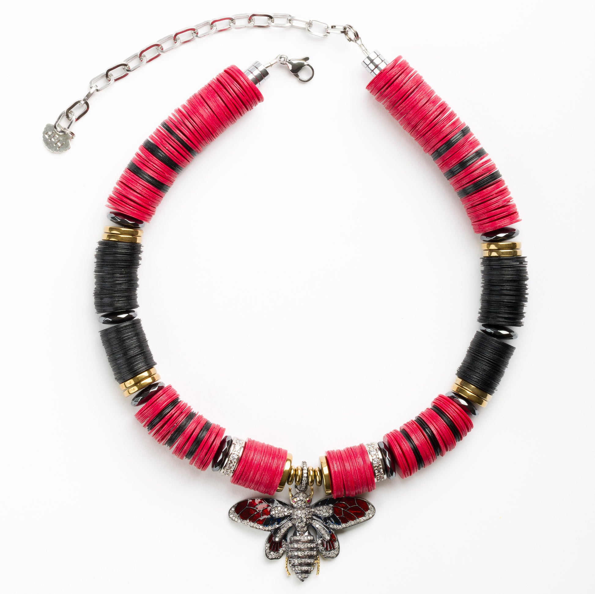 Jaipur 14mm Red & Black African Bead Necklace with 925 Sterling Silver Enamel Bee Pendant with Cognac Diamonds, with Micro Pave Cubic Zirconia and Golden Derived Hematite Rondelles and Adjustable Gold Plated Brass Cable Chain.