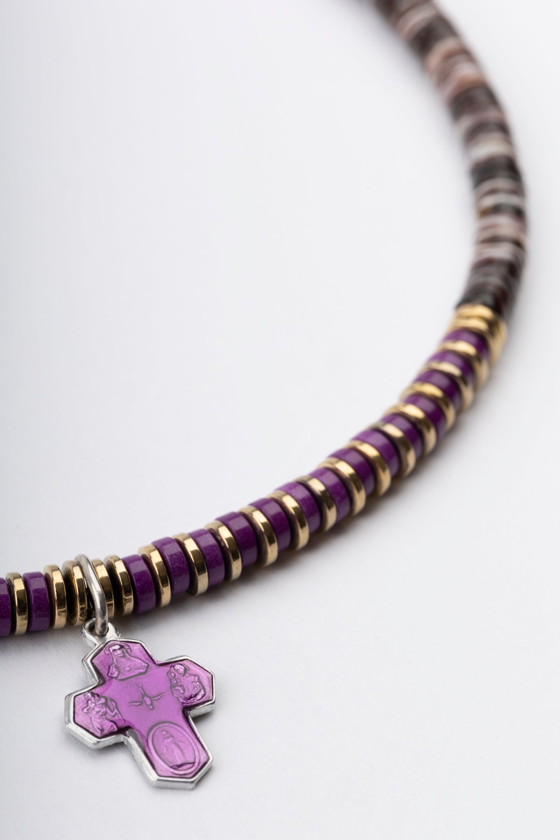 Oyster Sea Shell Puka Necklace with Aluminum Epoxy Enamel Cross Medal, Purple Natural Agate Beads, Golden Volcanic-Derived Hematite Rondelles and Adjustable Platinum Plated Brass Cable Chain.