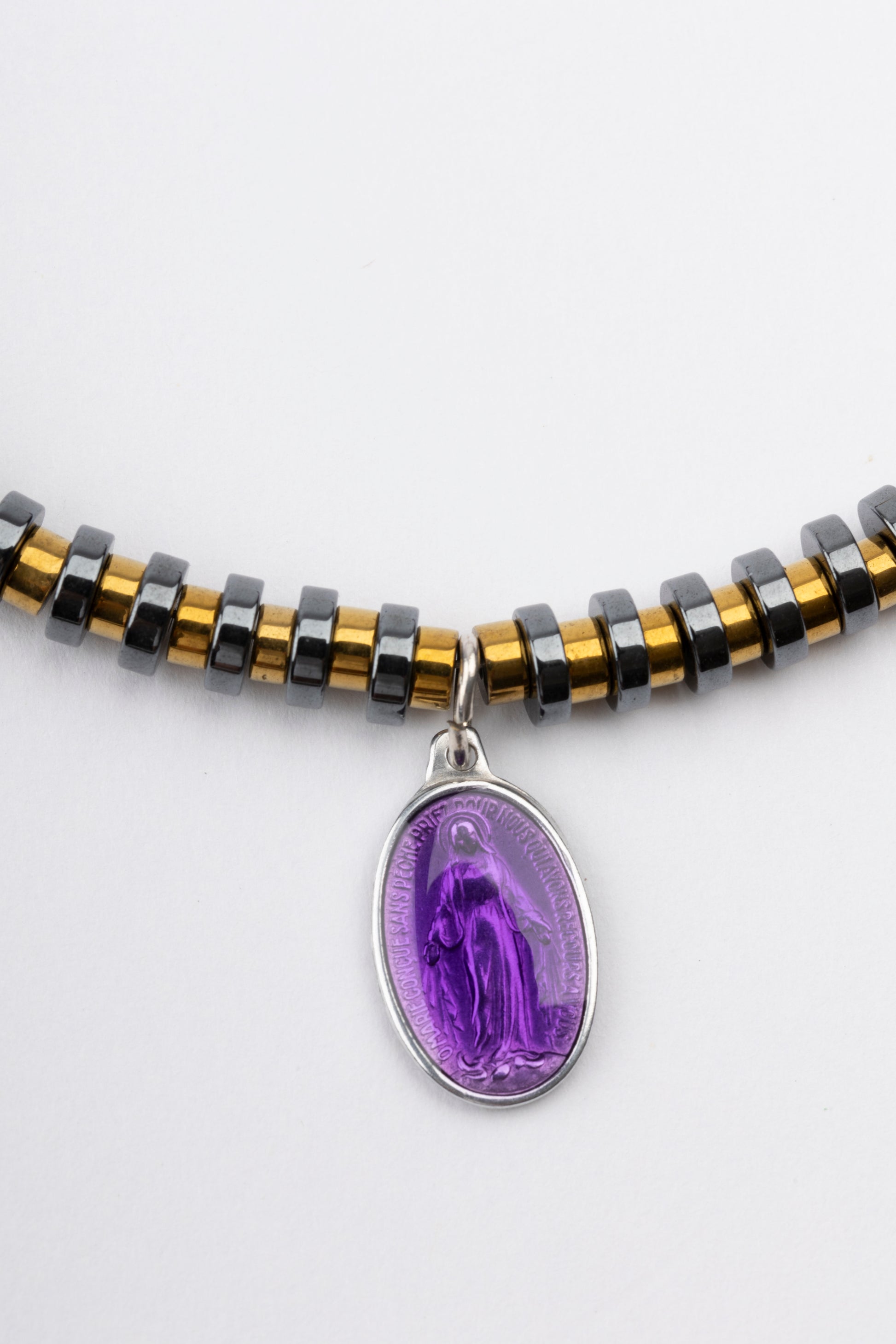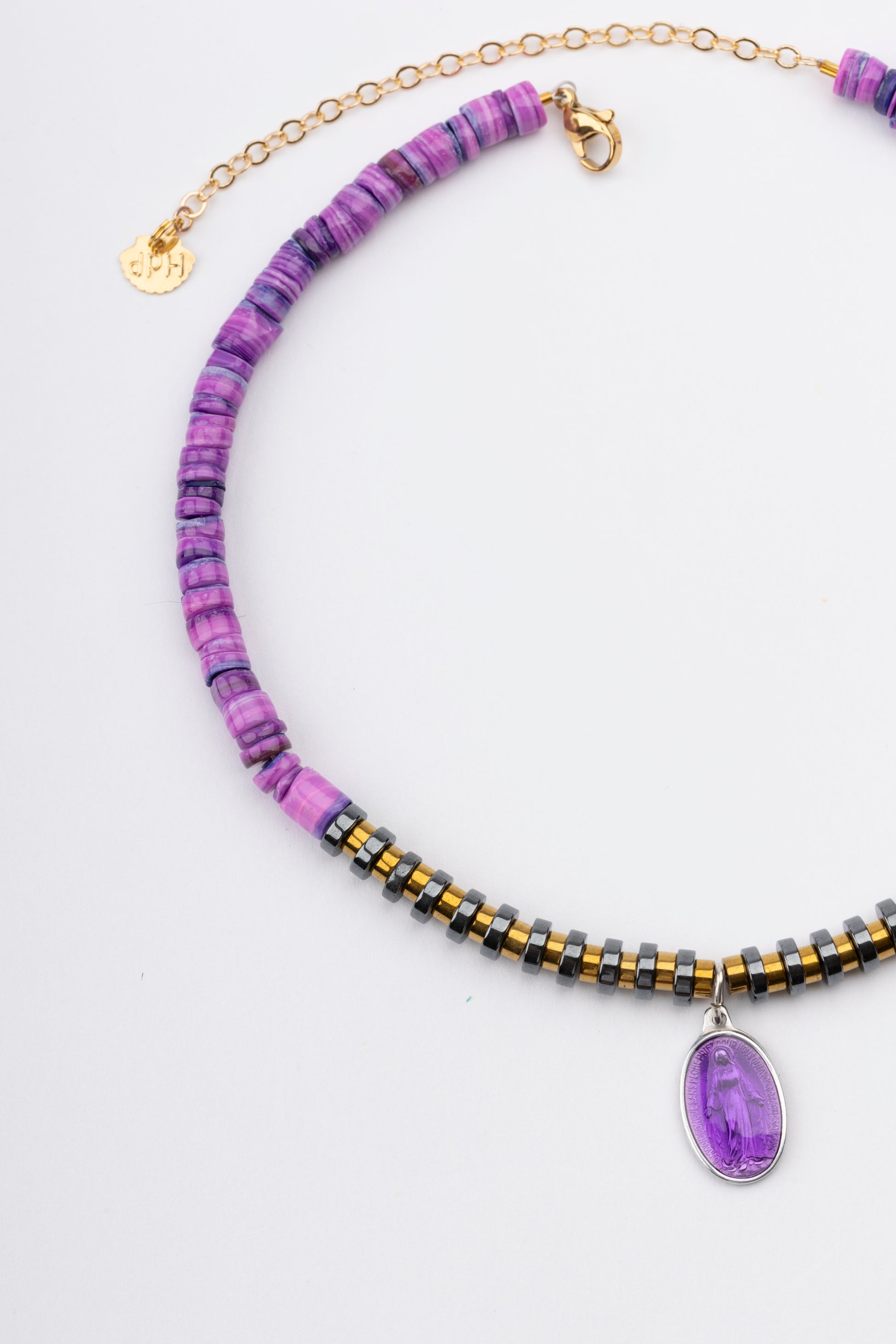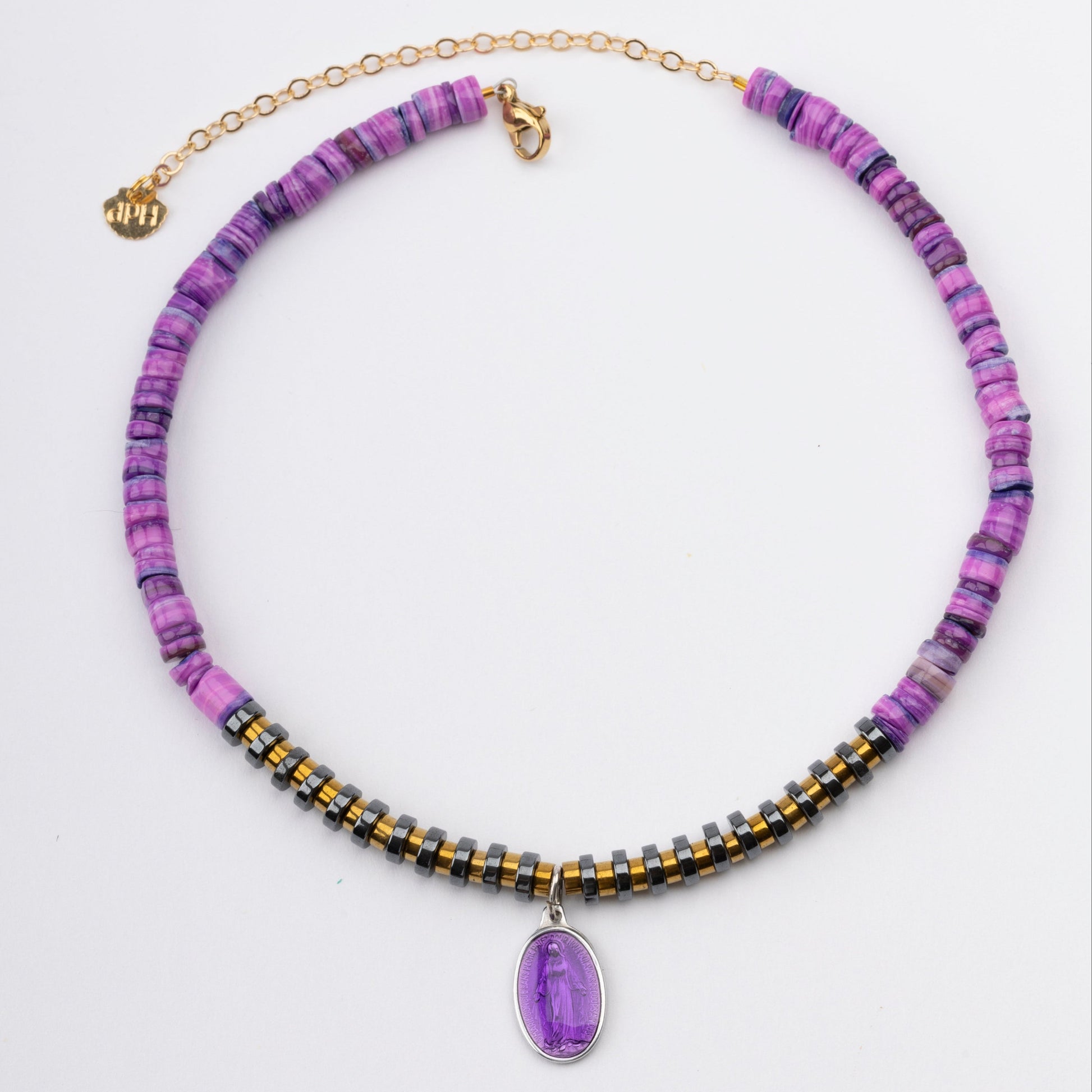 Purple Dyed Sea Shell Puka Necklace with Aluminum Epoxy Enamel Virgin Medal, Golden and Black Volcanic-Derived Hematite Rondelles and Adjustable Gold Plated Brass Cable Chain.