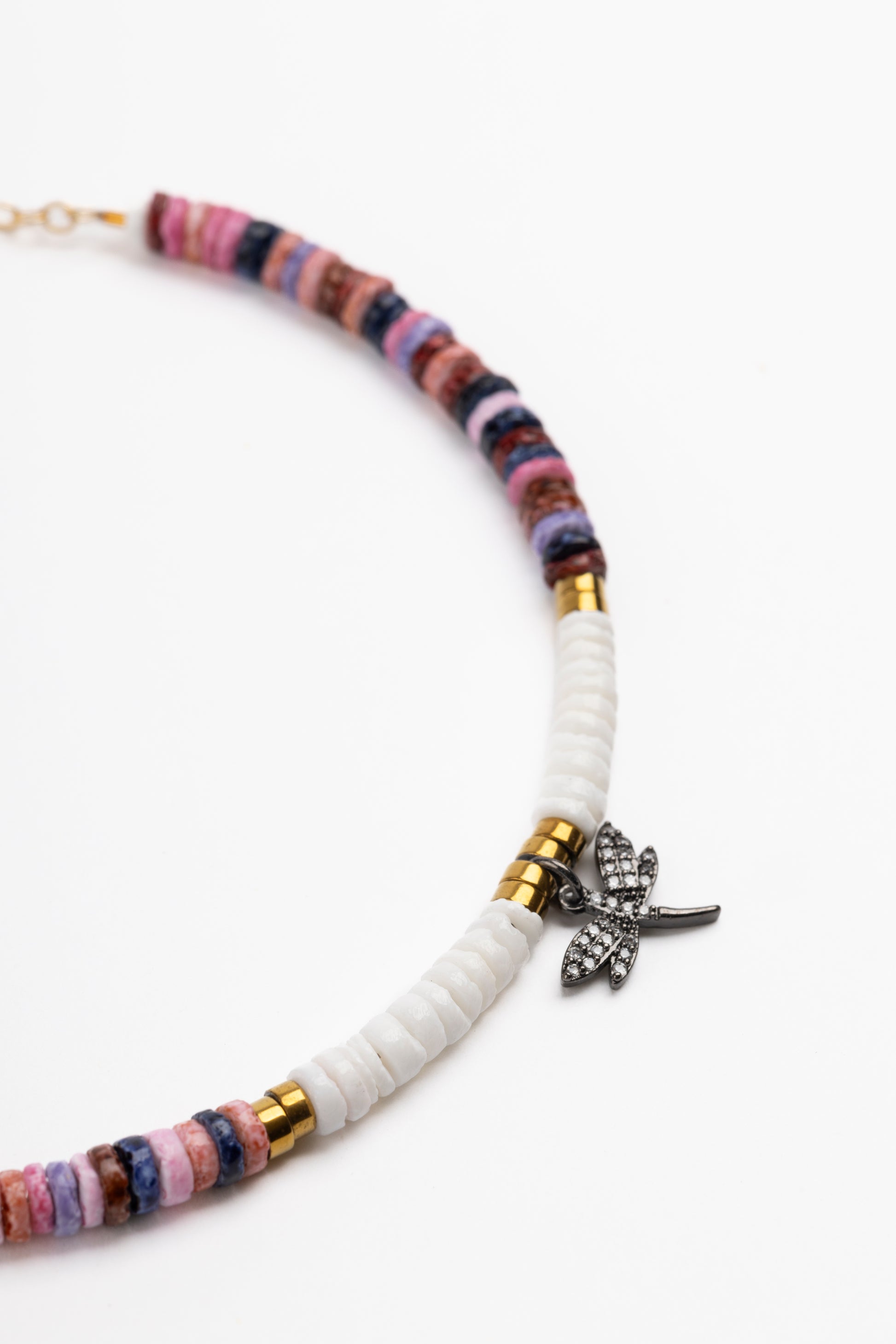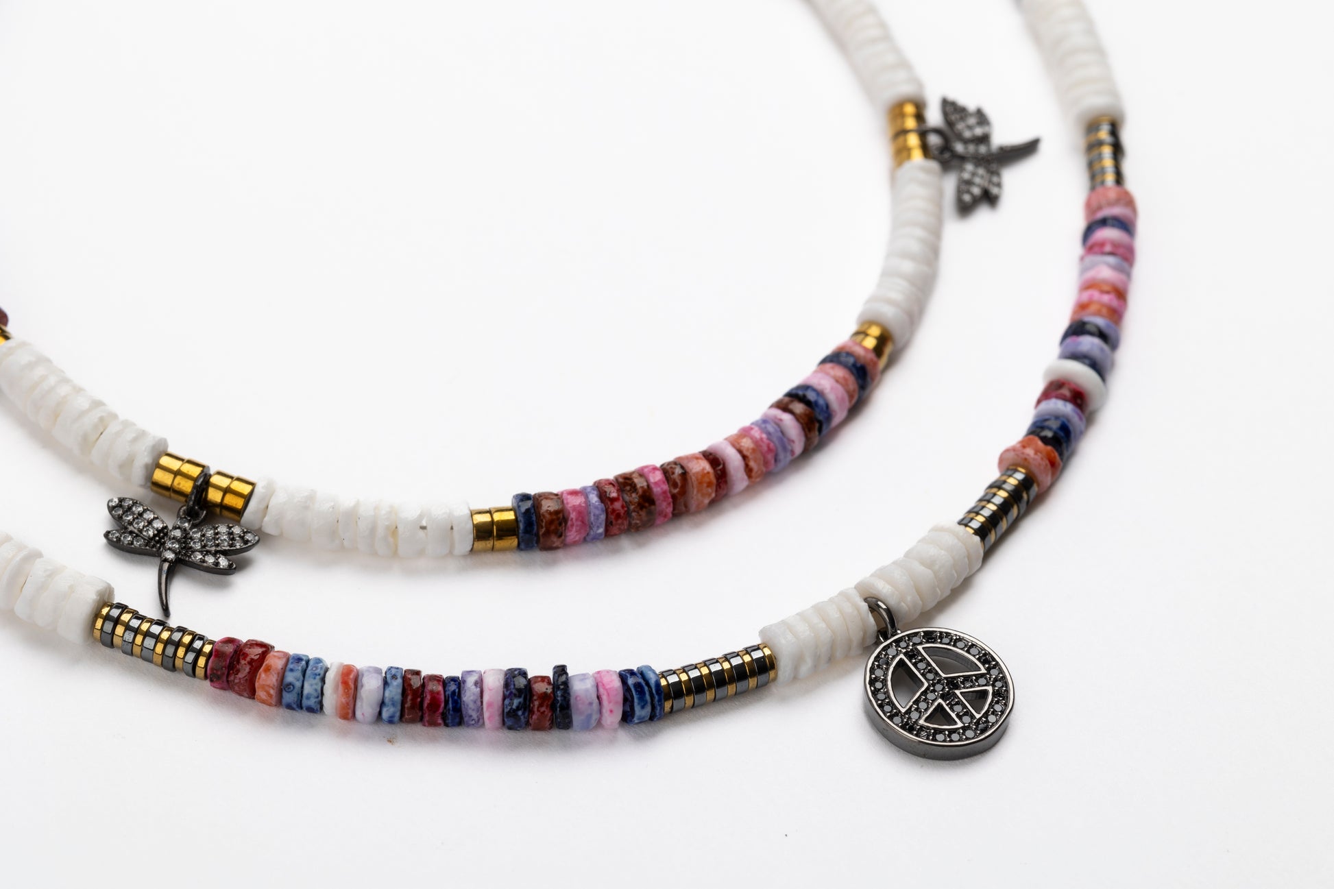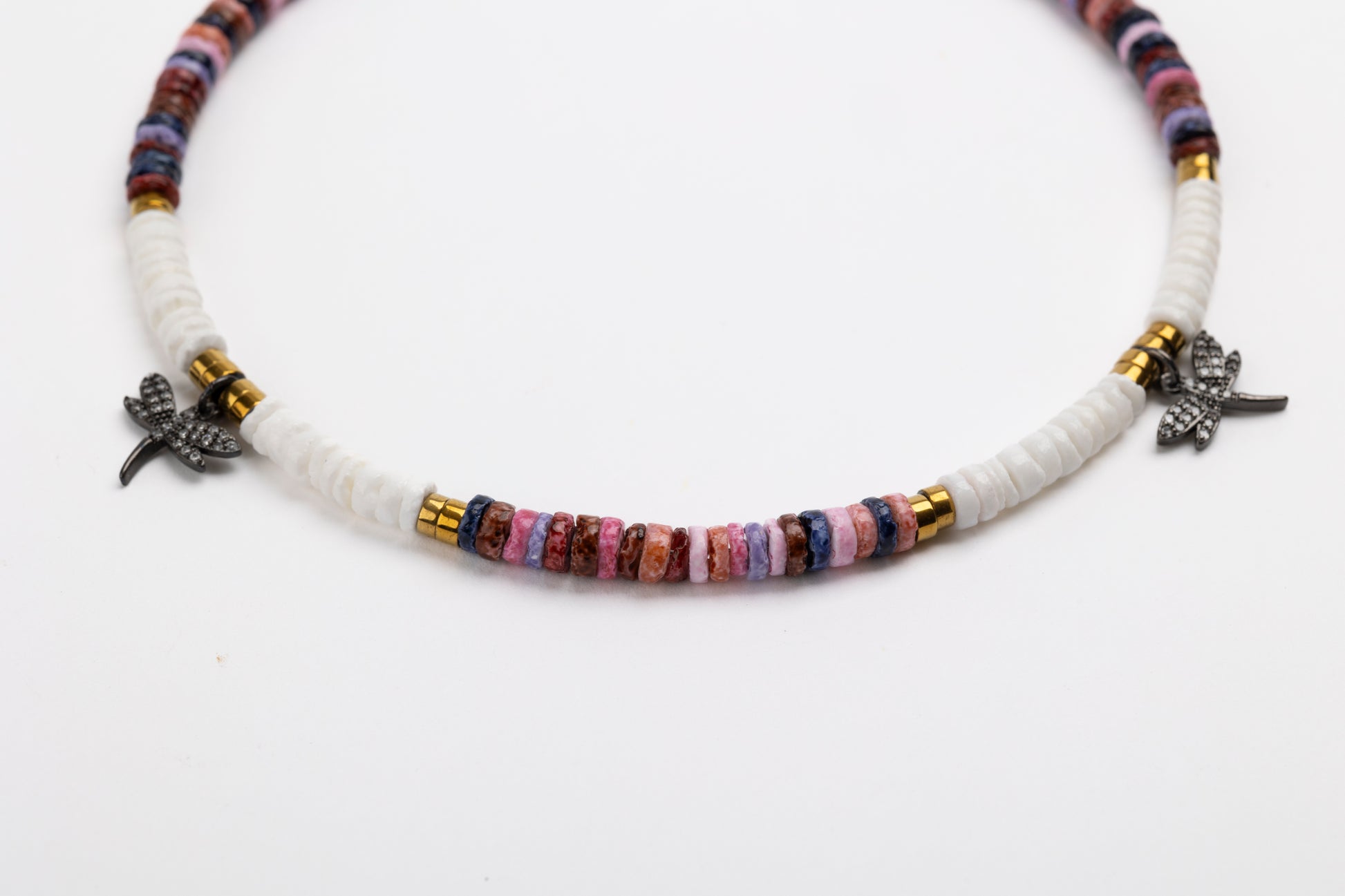 Multi color Dyed Sea Shell Puka Necklace with Micro Pave Cubic Zirconia Fireflies, Golden Volcanic-Derived Hematite Rondelles and Adjustable Gold Plated Brass Cable Chain.