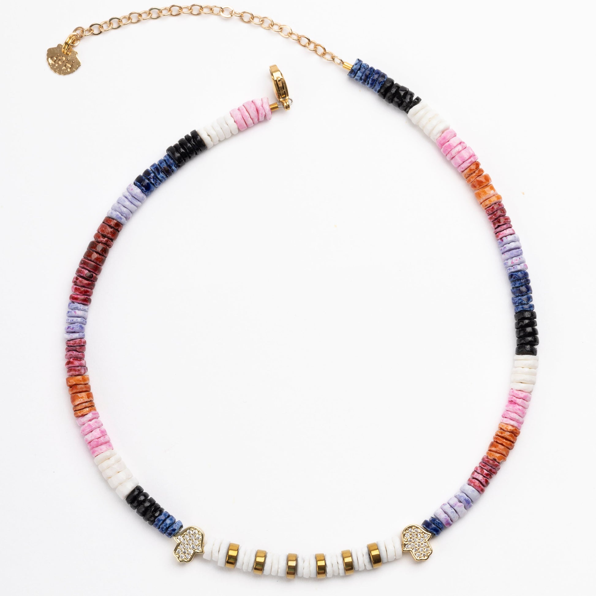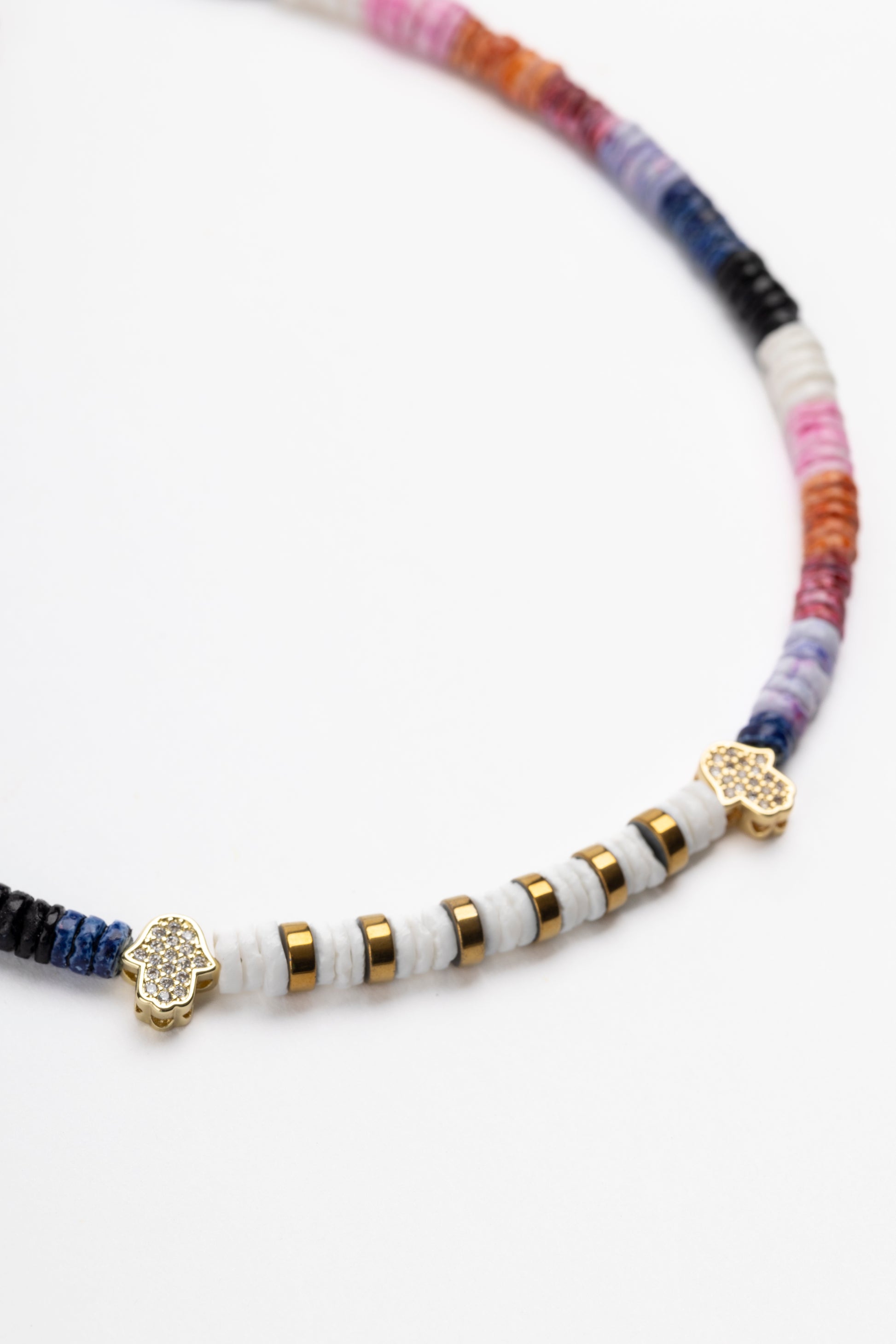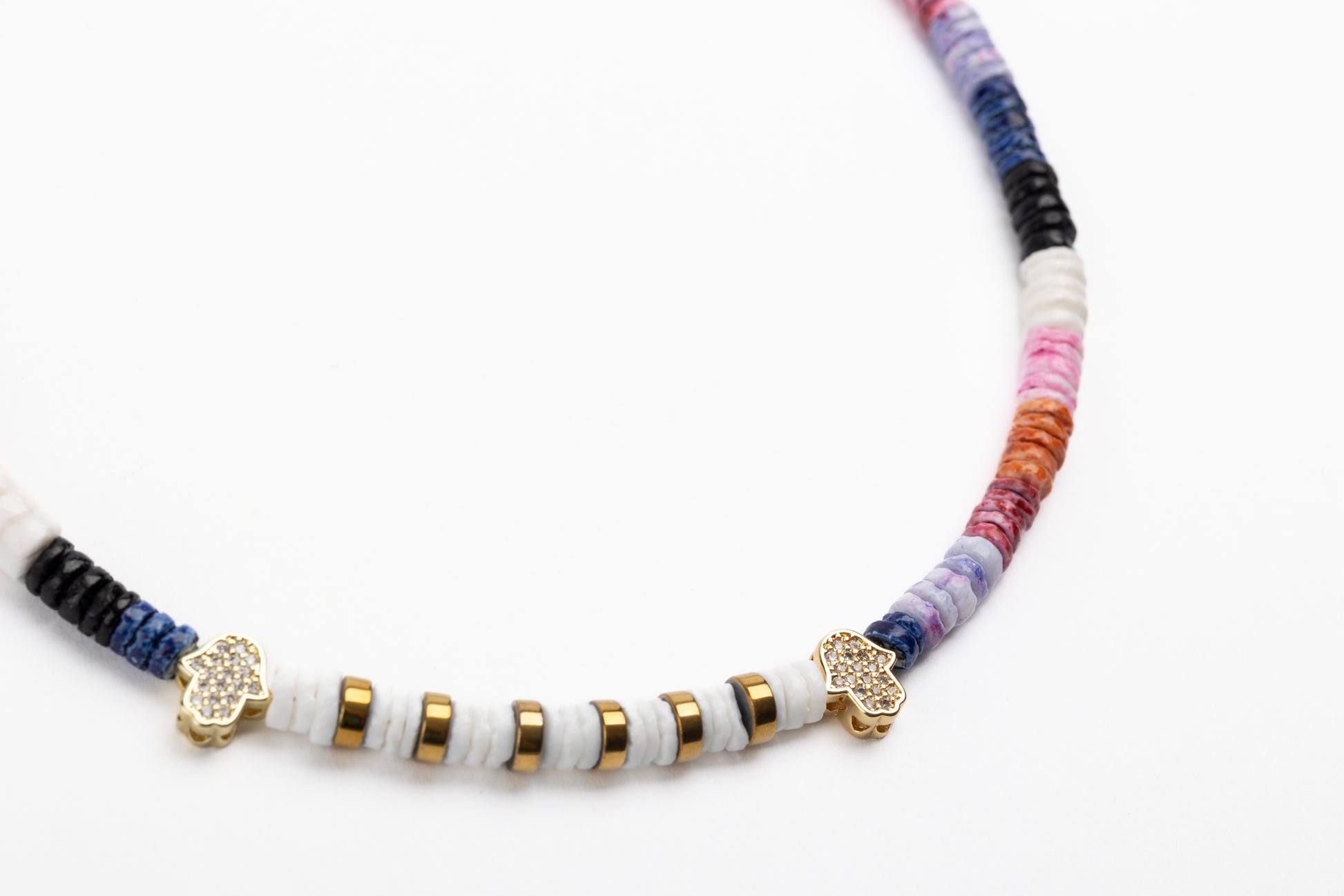 Multi color Dyed Sea Shell Puka Necklace with Micro Pave Cubic Zirconia Hamsas, Golden Volcanic-Derived Hematite Rondelles and Adjustable Gold Plated Brass Cable Chain.