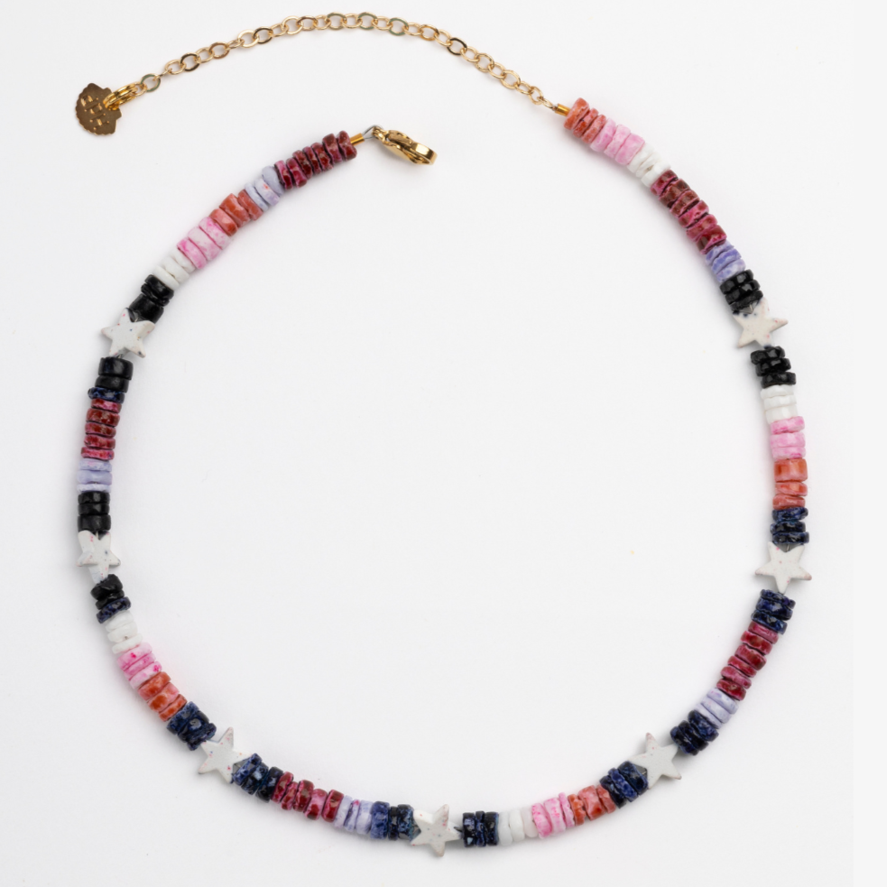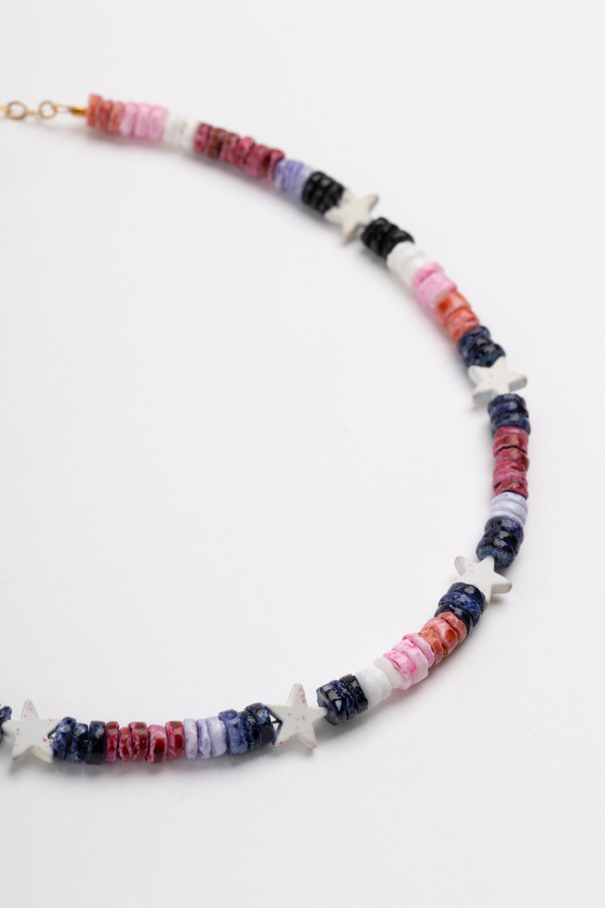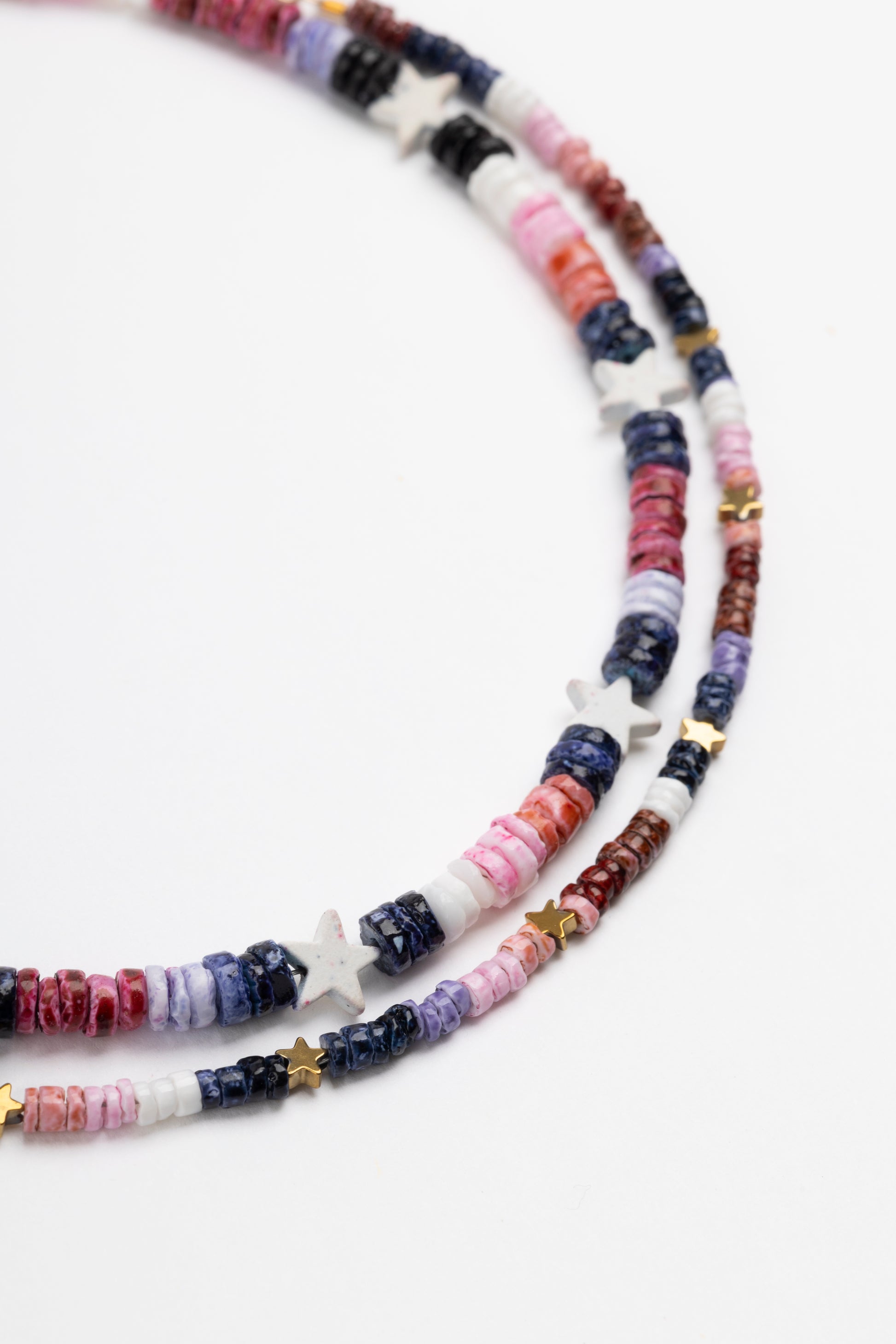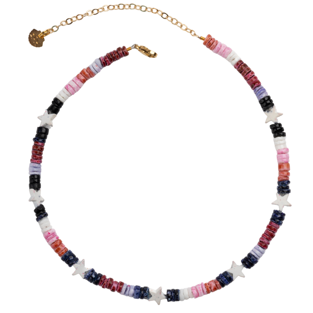 Multi color Dyed Sea Shell Puka Necklace with Dyed Volcanic-Derived Hematite Stars and Adjustable Gold Plated Brass Cable Chain.