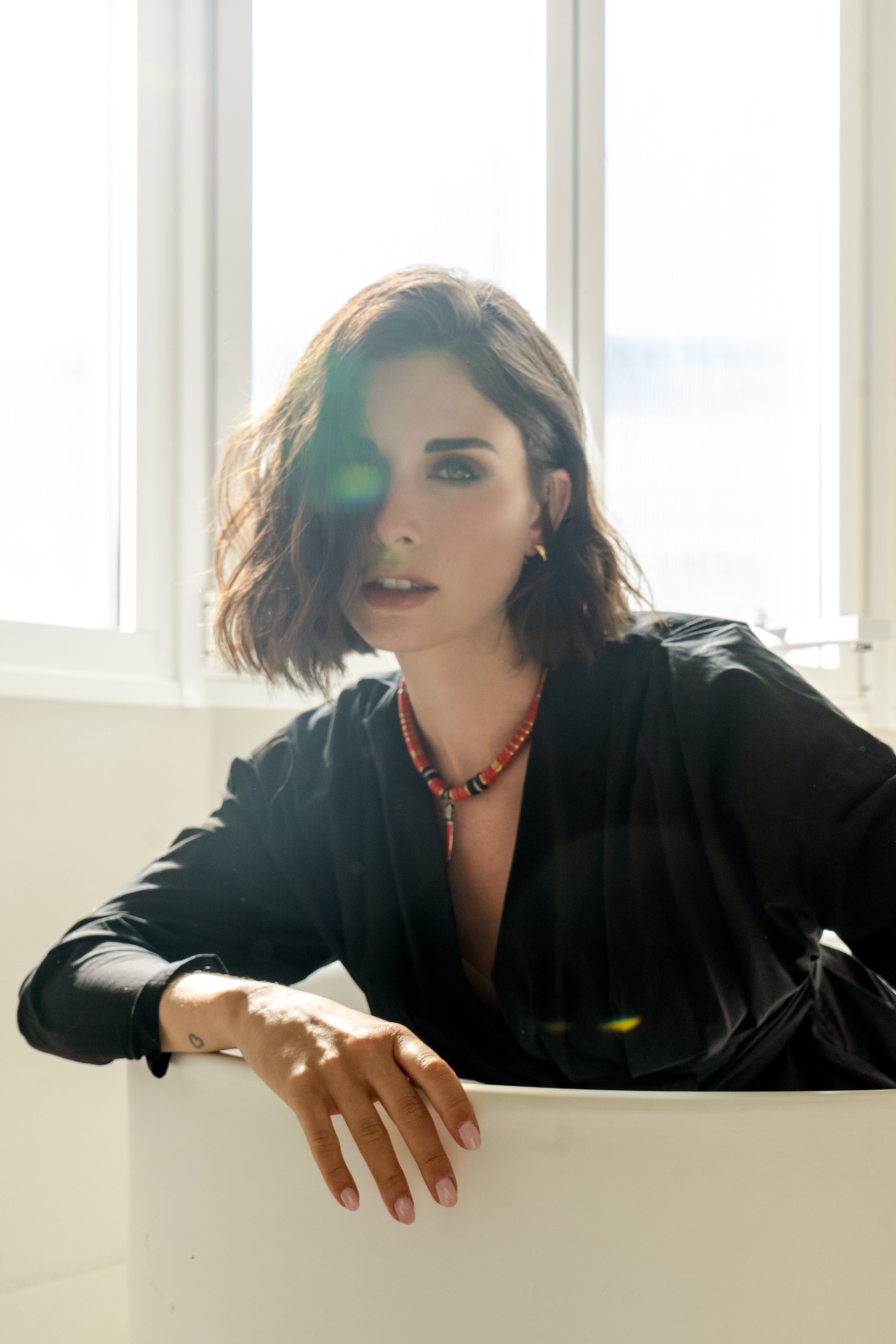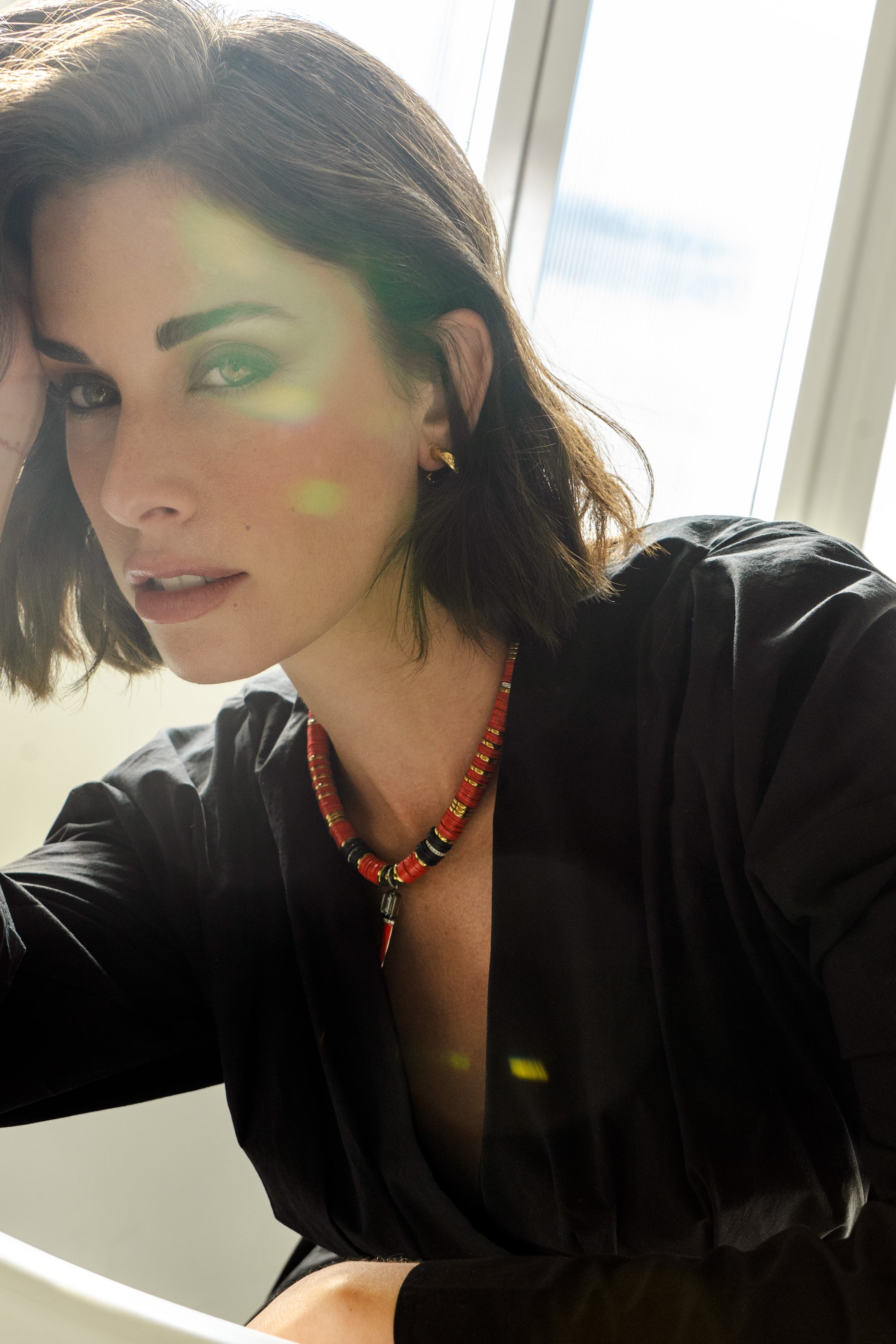 Black/Red 10mm African Bead Necklace with Sterling Silver red enamel horn with blue topaz and cogac diamonds pendant, Black/Gold Volcanic-Derived Hematite Rondelles and Adjustable Gold Plated Brass Cable Chain.