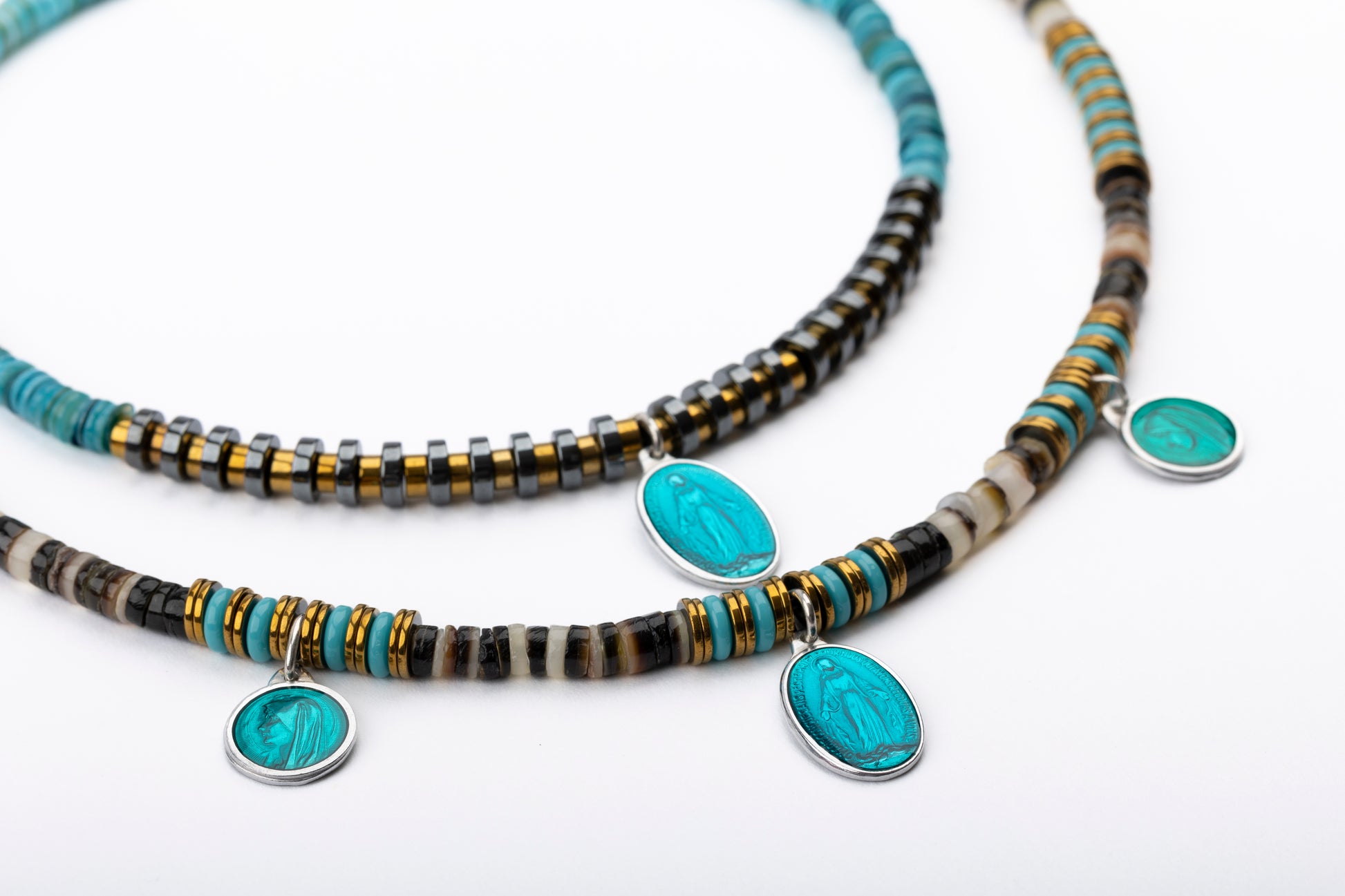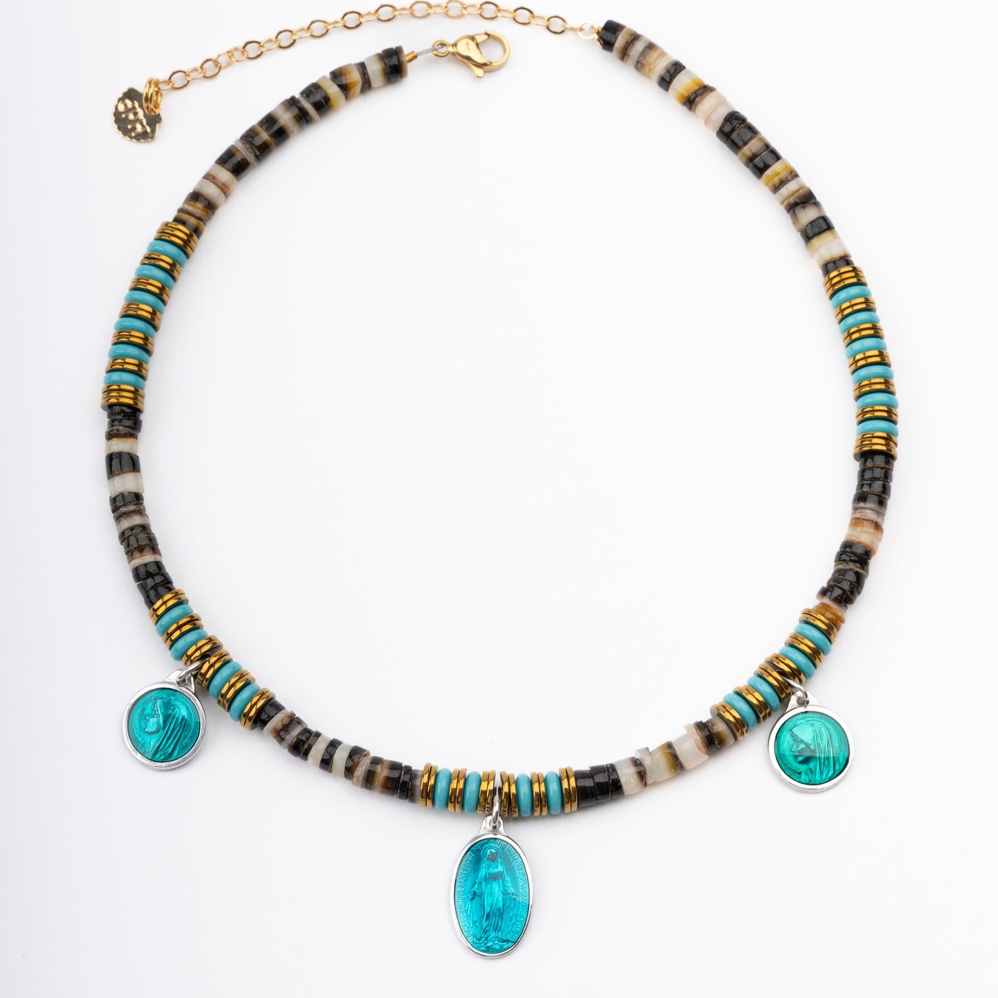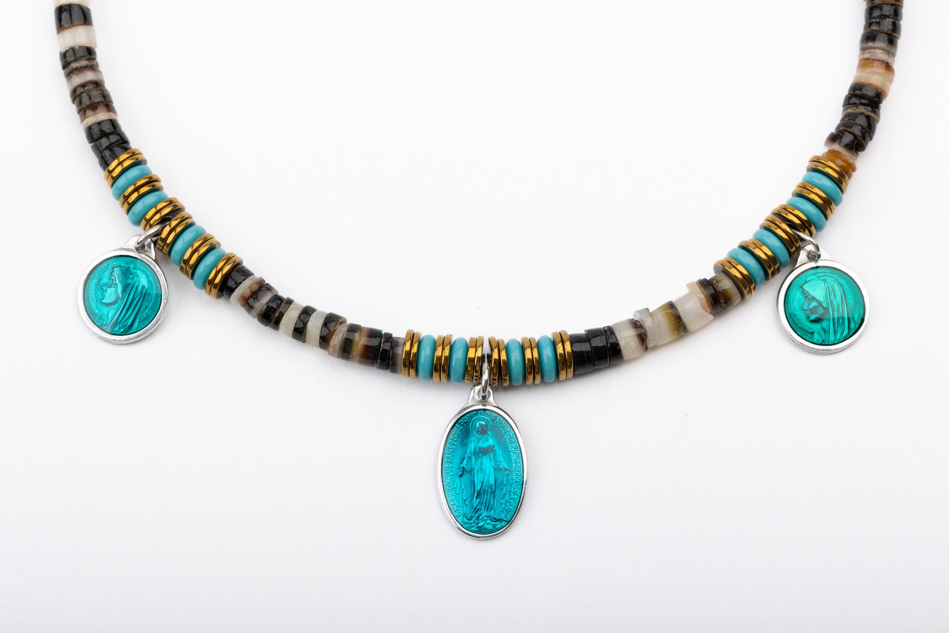 Oyster Shell Puka Necklace with 3 Aluminum Epoxy Enamel Virgin Medals, Golden Volcanic-Derived Hematite Rondelles and Adjustable Gold Plated Brass Cable Chain.