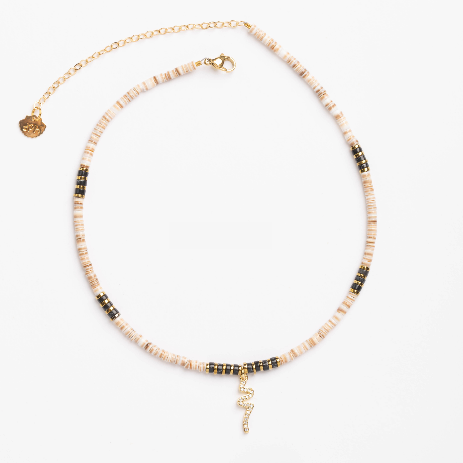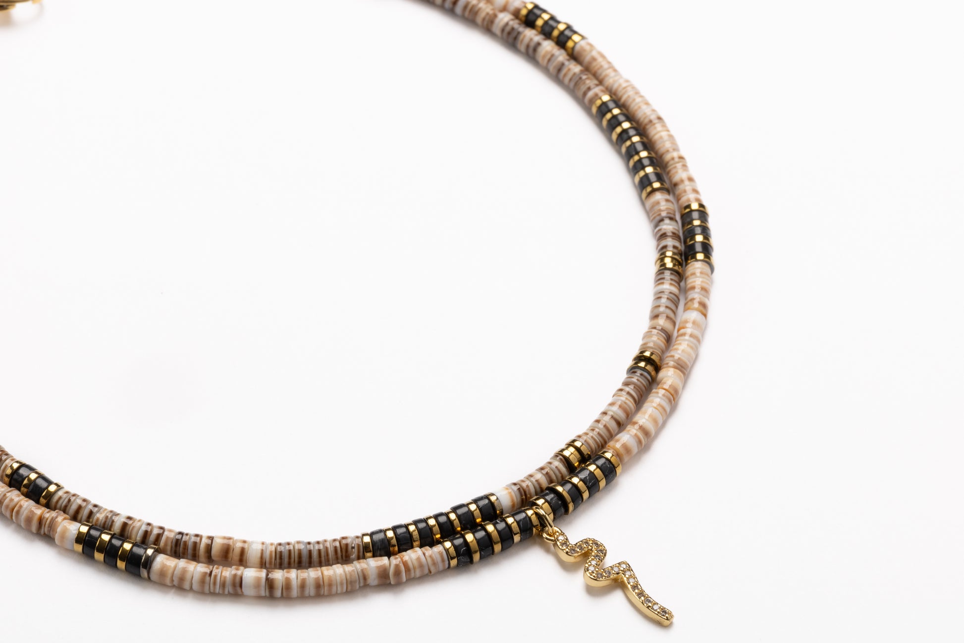Nano Mustard Sea Shell 3mm Puka Necklace with Micro Pave Cubic Snake, Black Agate Beads, Golden Volcanic-Derived Hematite Rondelles and Adjustable Gold Plated Brass Cable Chain.